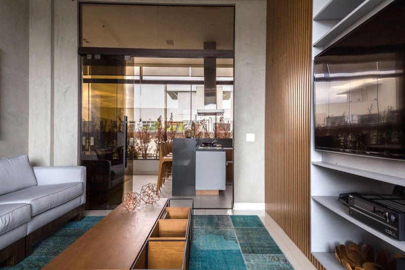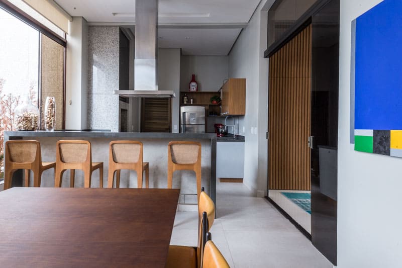 grande espaço contínuo, onde sala de estar, sala de TV e espaço gourmet se integram de