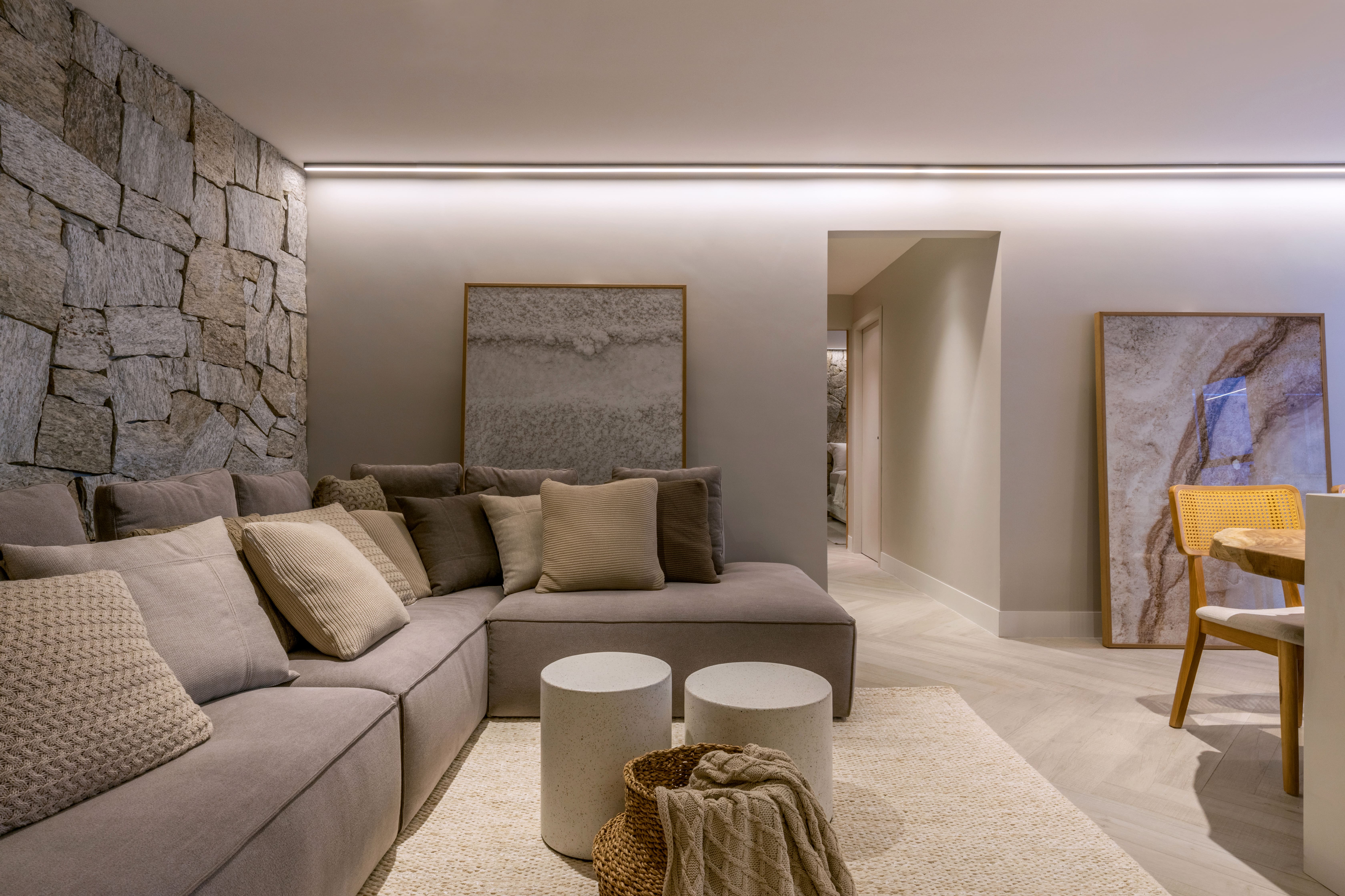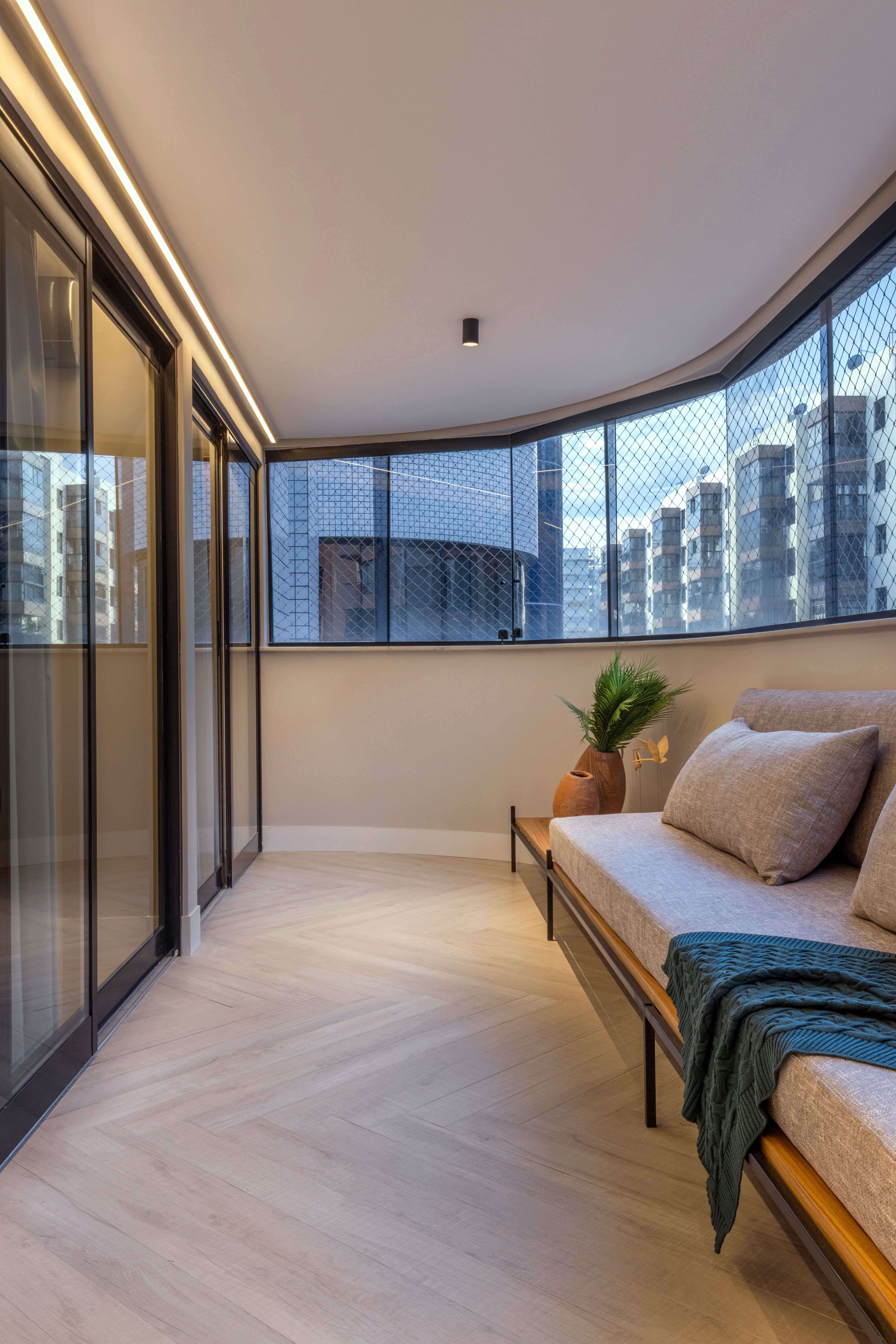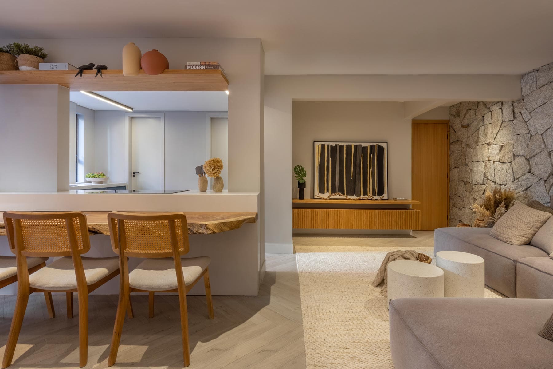 A estética do apartamento é definida logo na entrada por uma parede revestida em pedra moledo, cujo aspeto bruto contrasta com a sobriedade das paredes lisas cinzentas, enquanto a marcenaria azulada da cozinha e os detalhes em madeira introduzem aconchego e ludicidade. A varanda foi incorporada na área social através da remoção da esquadria divisória, ganhando um banco baixo que percorre todo o perímetro e serve tanto para receber visitas como para momentos de trabalho ou leitura.