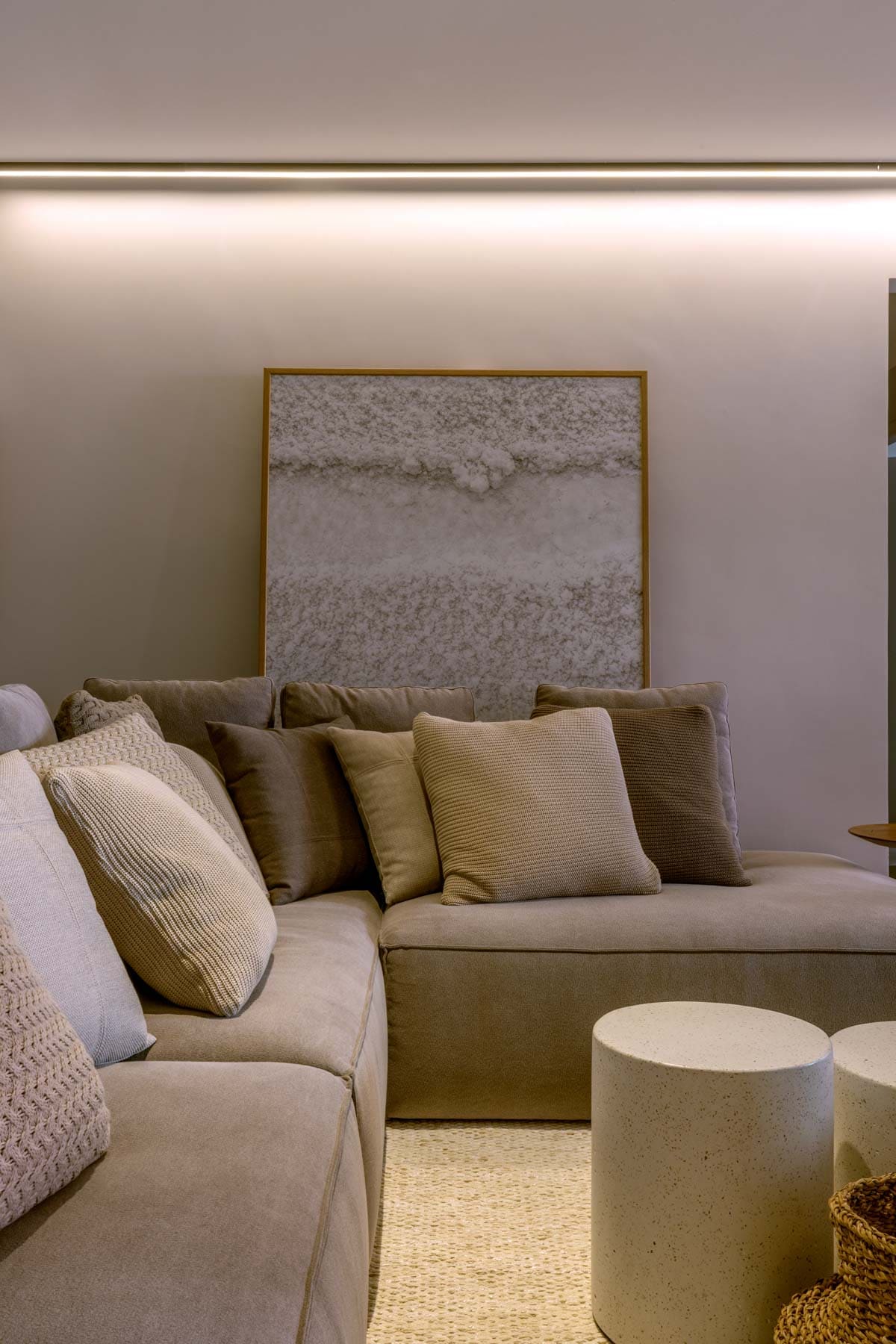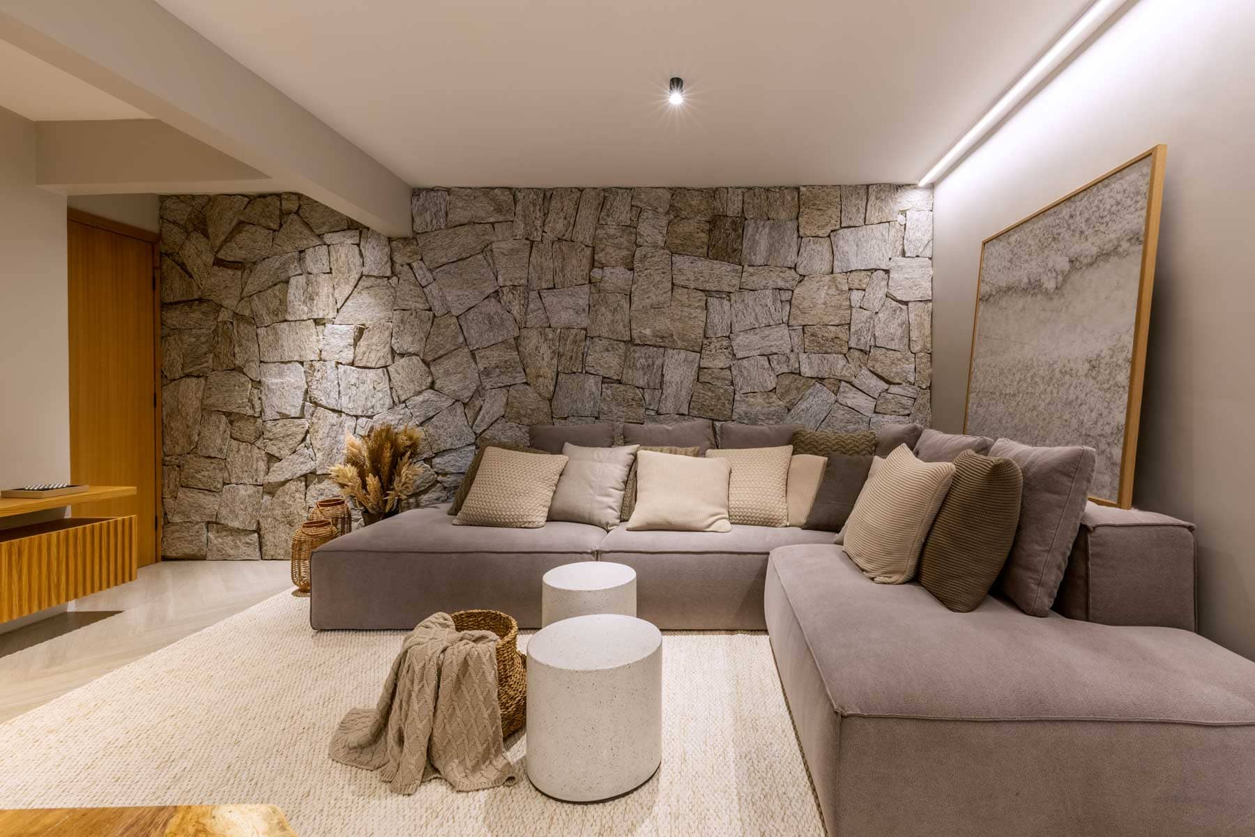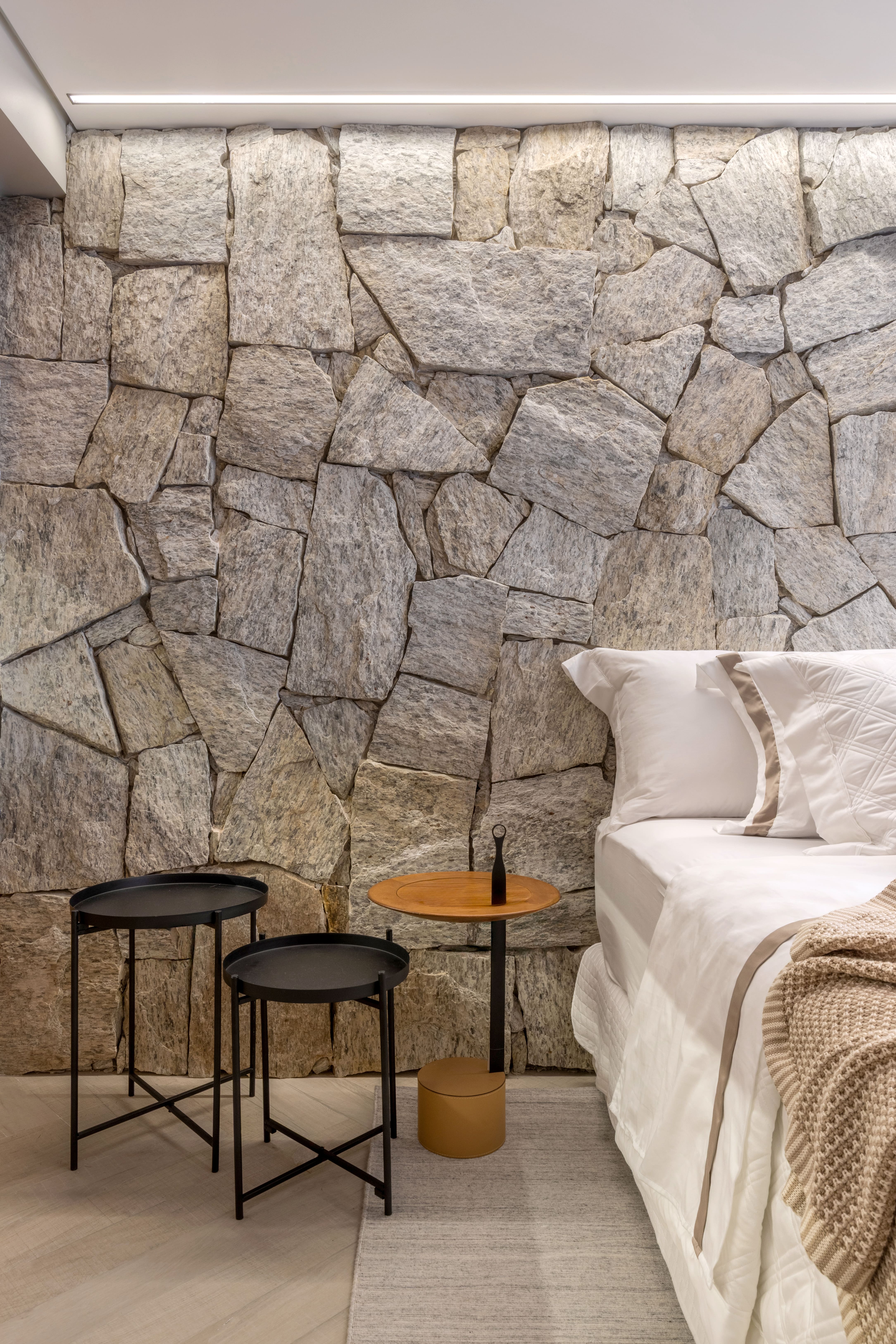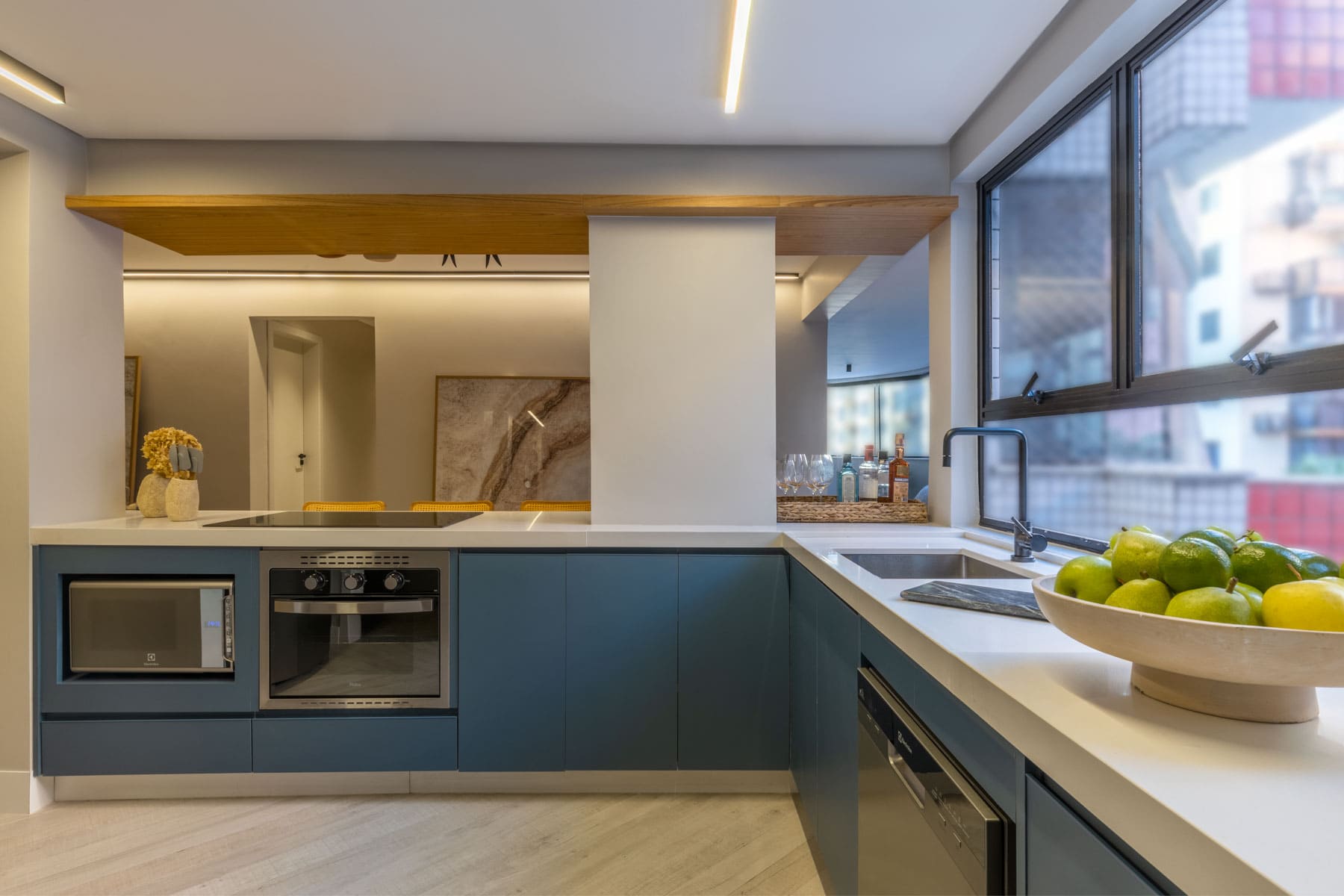 A estética do apartamento é definida logo na entrada por uma parede revestida em pedra moledo, cujo aspeto bruto contrasta com a sobriedade das paredes lisas cinzentas, enquanto a marcenaria azulada da cozinha e os detalhes em madeira introduzem aconchego e ludicidade. A varanda foi incorporada na área social através da remoção da esquadria divisória, ganhando um banco baixo que percorre todo o perímetro e serve tanto para receber visitas como para momentos de trabalho ou leitura.