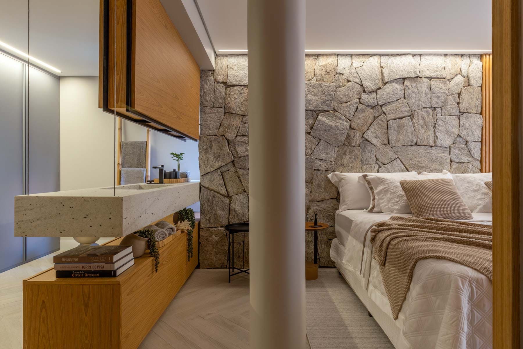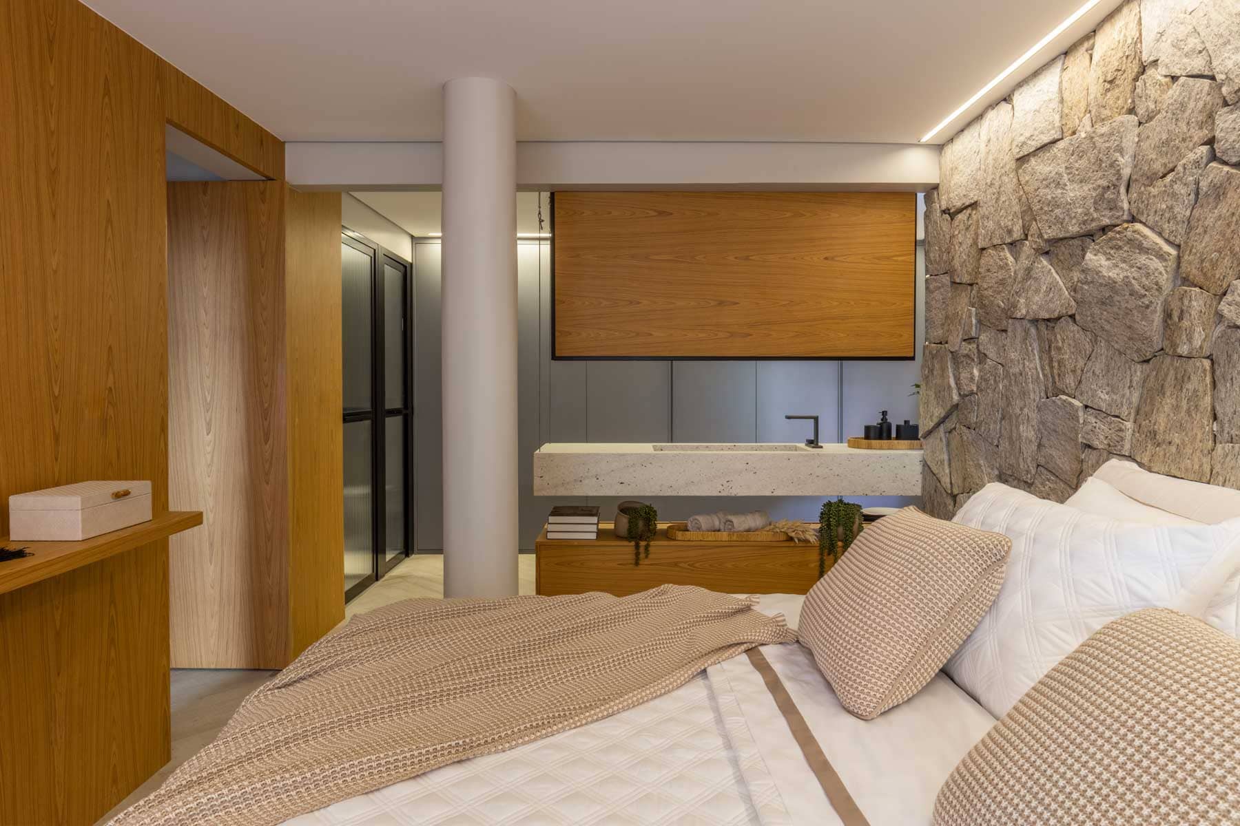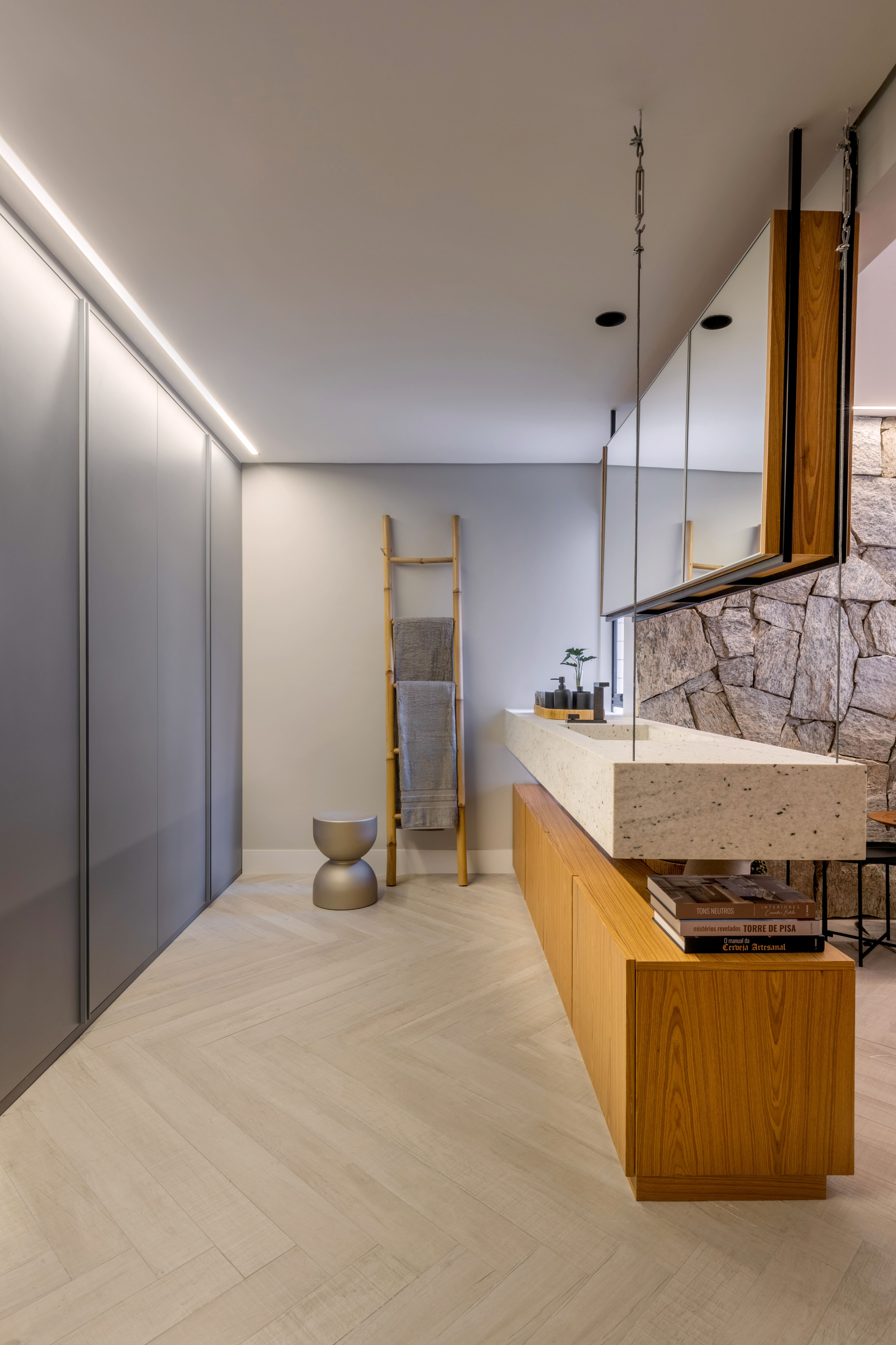 Na zona íntima, a suíte master mantém a linguagem contemporânea do restante imóvel, combinando materiais neutros com o calor da madeira. O destaque vai para o lavatório com uma bancada solta que parece flutuar e divide o espaço do quarto e do closet, além do uso de portas em vidro canelado para o chuveiro e a cabine sanitária, permitindo a entrada de luz natural sem comprometer a privacidade.