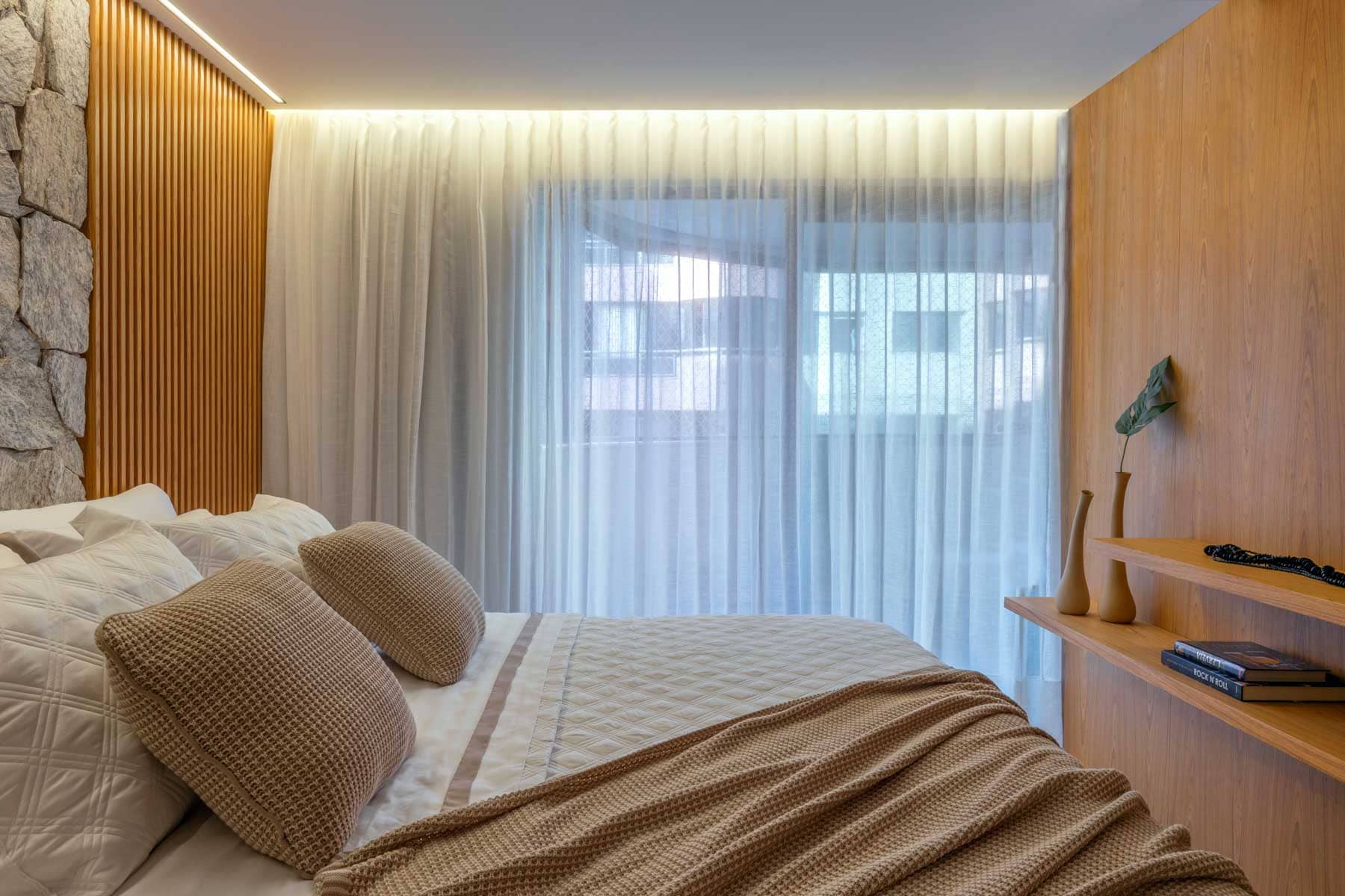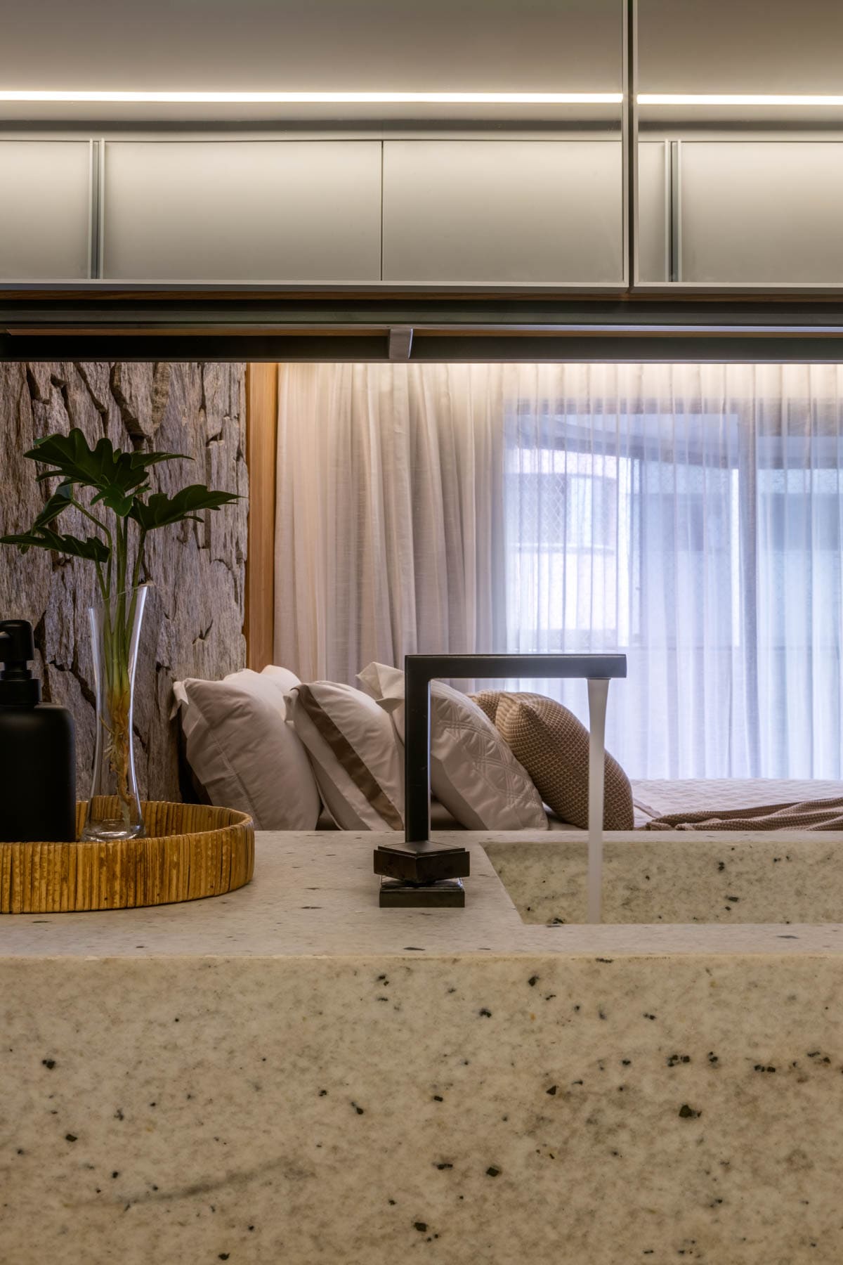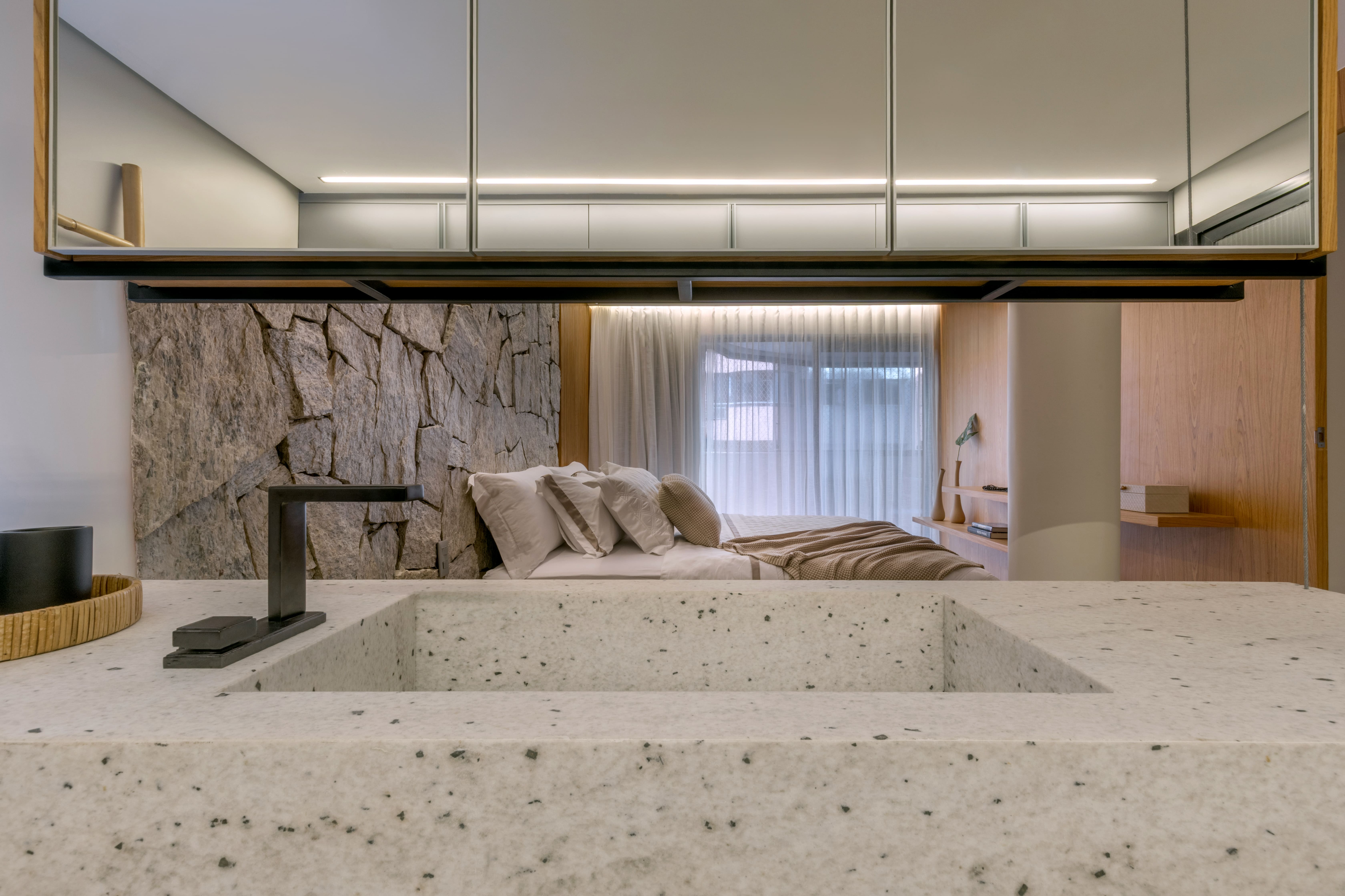 Na zona íntima, a suíte master mantém a linguagem contemporânea do restante imóvel, combinando materiais neutros com o calor da madeira. O destaque vai para o lavatório com uma bancada solta que parece flutuar e divide o espaço do quarto e do closet, além do uso de portas em vidro canelado para o chuveiro e a cabine sanitária, permitindo a entrada de luz natural sem comprometer a privacidade.