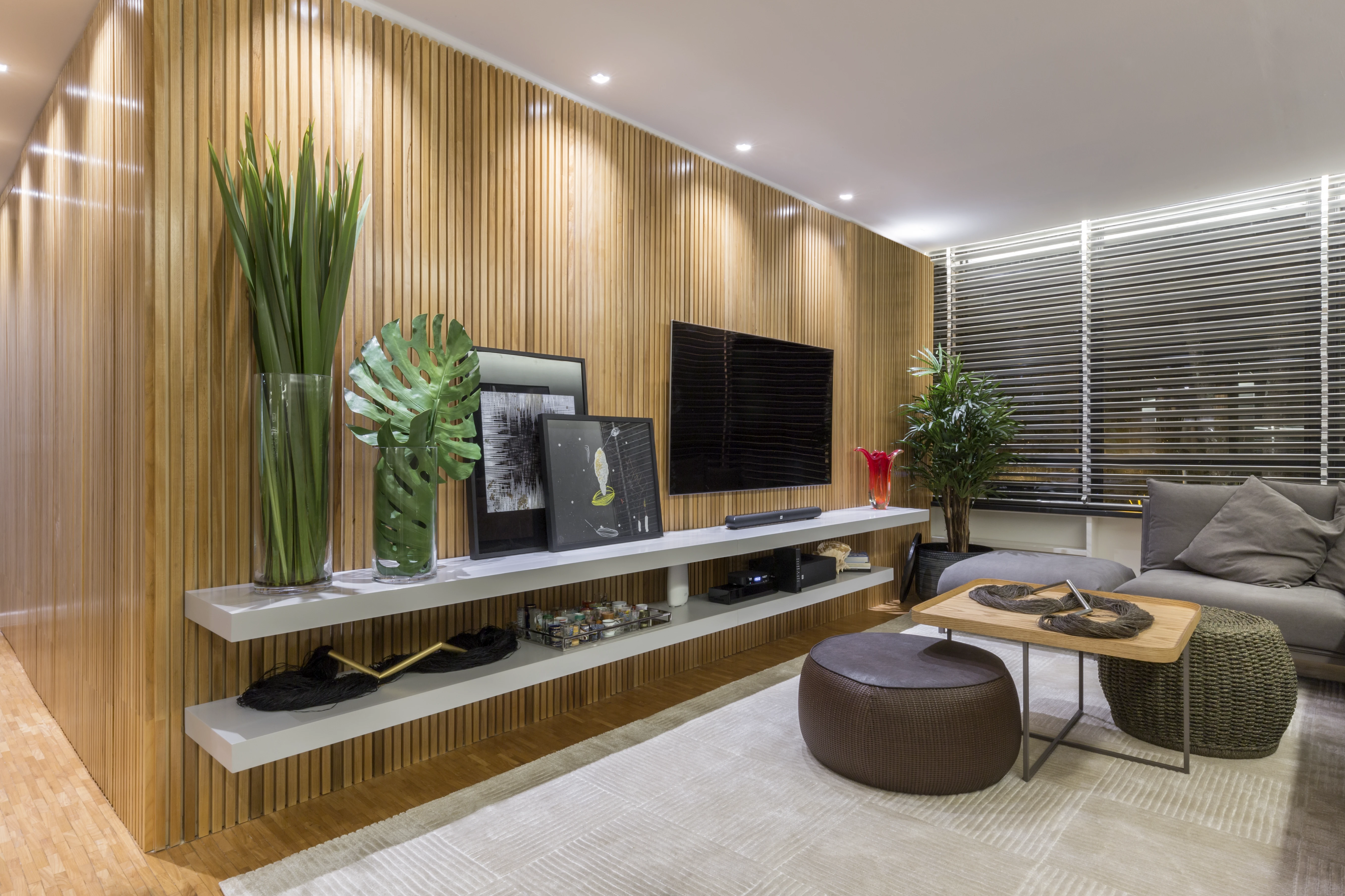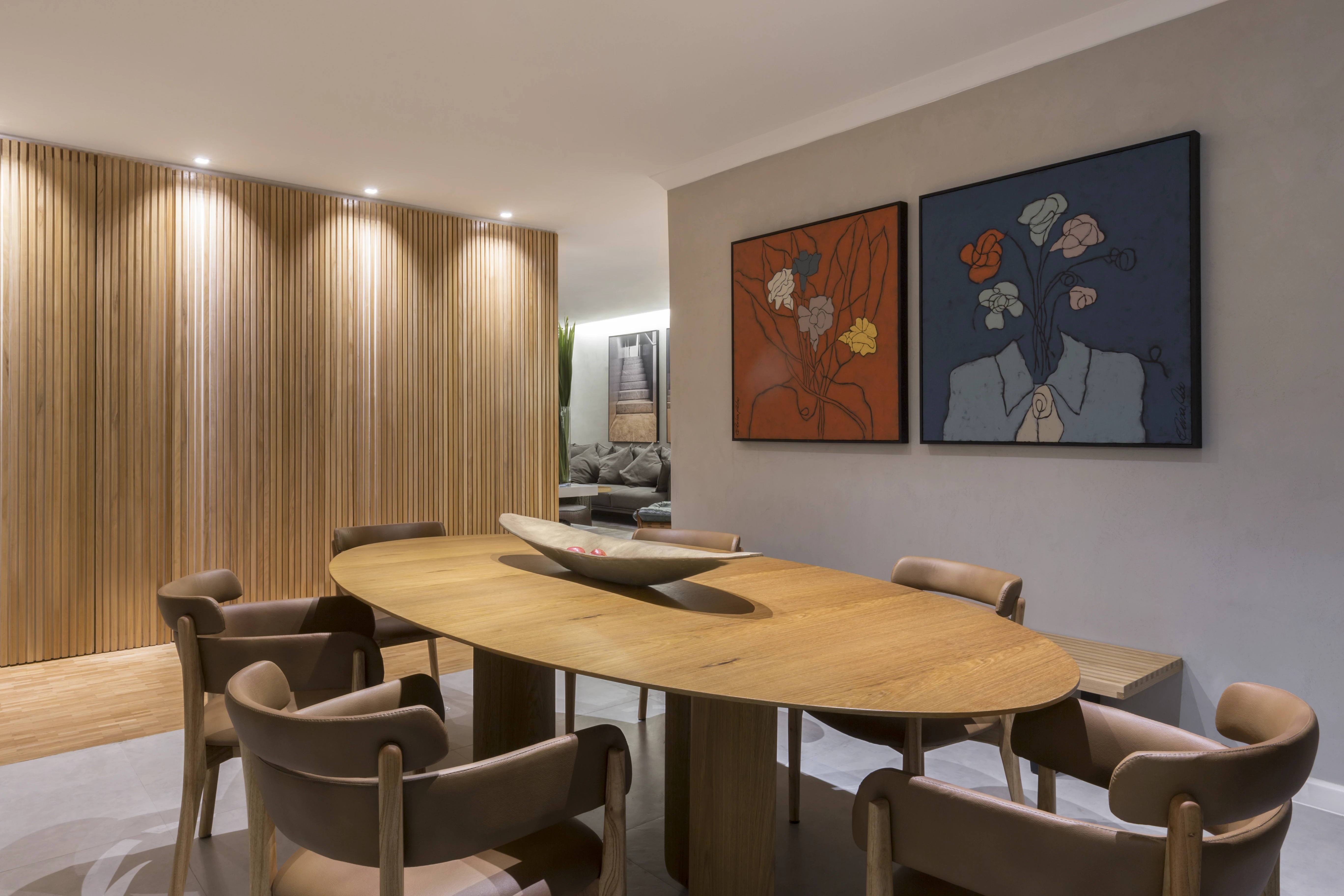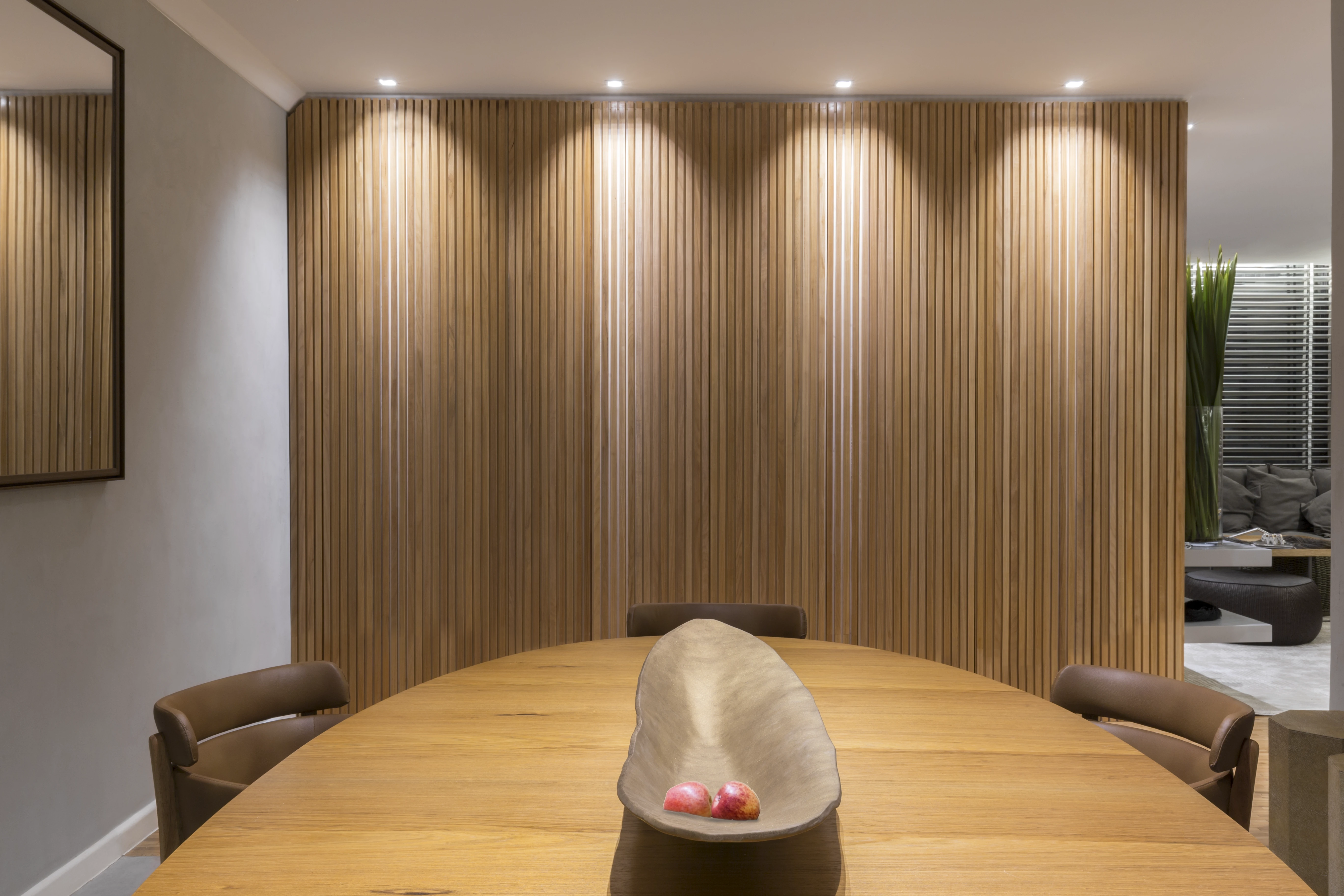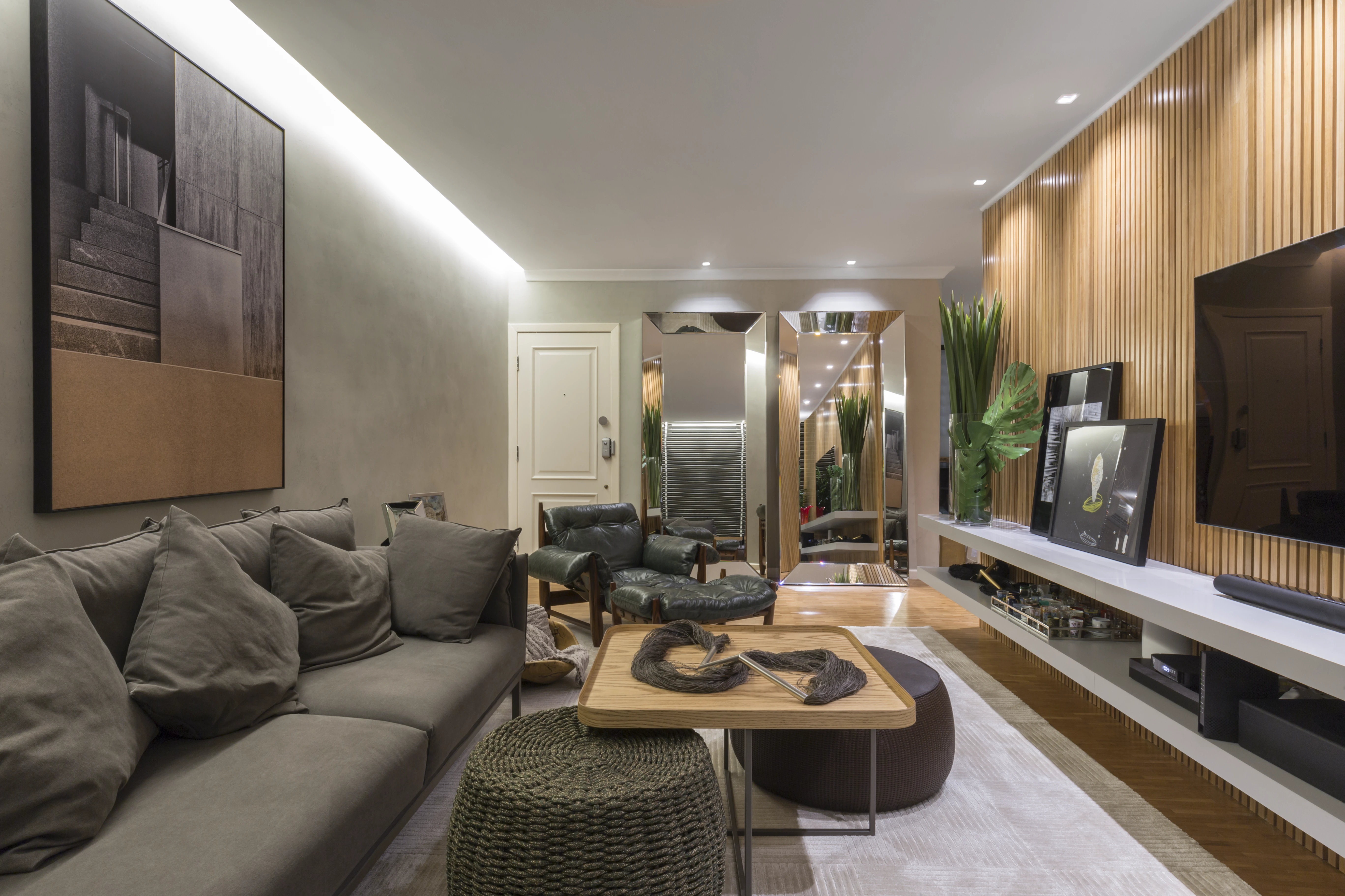 Na área social, a integração entre a sala de estar e a sala de jantar foi reforçada pela instalação de um painel de madeira ripada, criando uma sensação de continuidade anteriormente inexistente. O uso estratégico de espelhos foi fundamental para ampliar a perceção de espaço e luminosidade, servindo também para destacar peças de design, como a poltrona "Mole" de Sérgio Rodrigues, satisfazendo um desejo específico dos moradores.