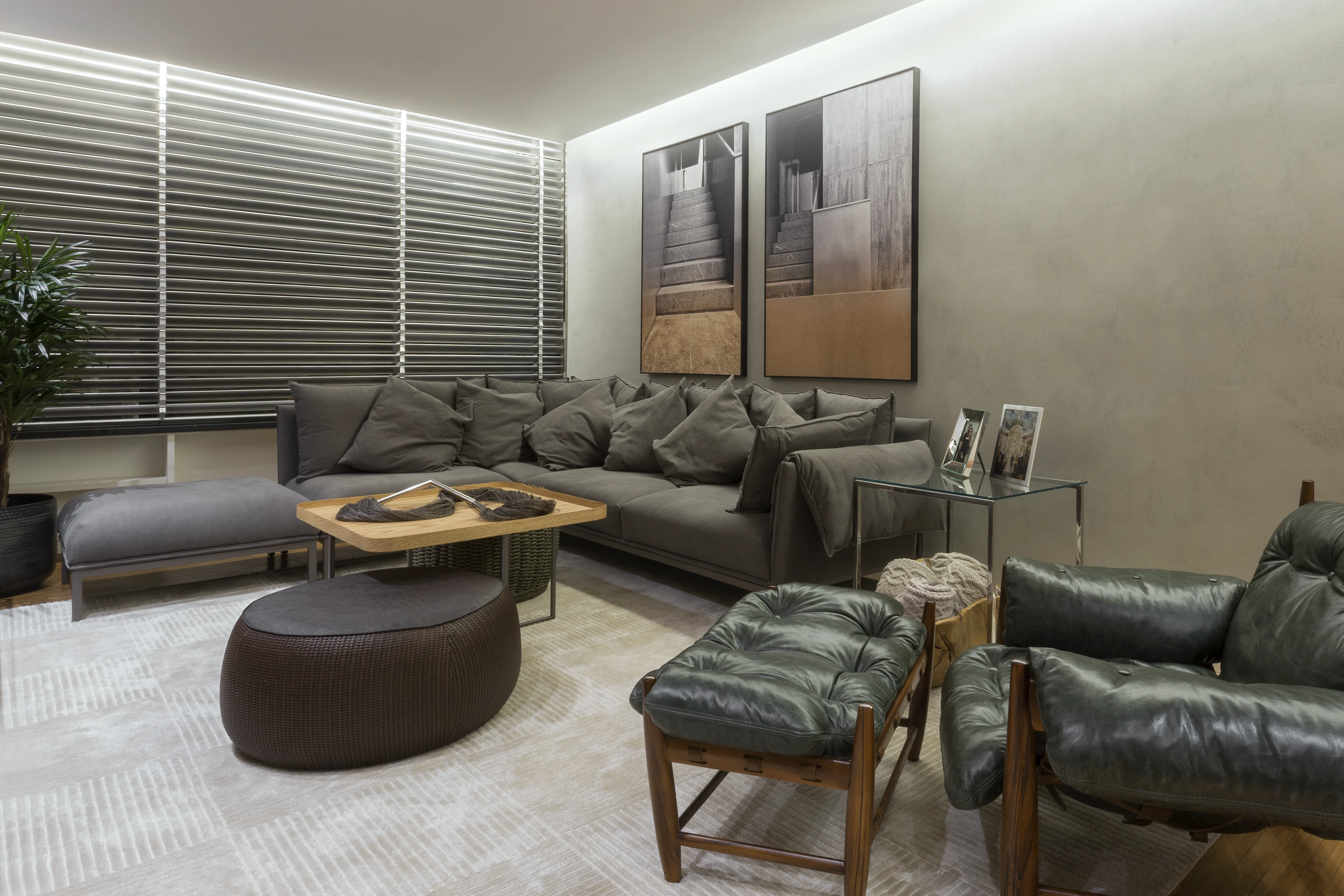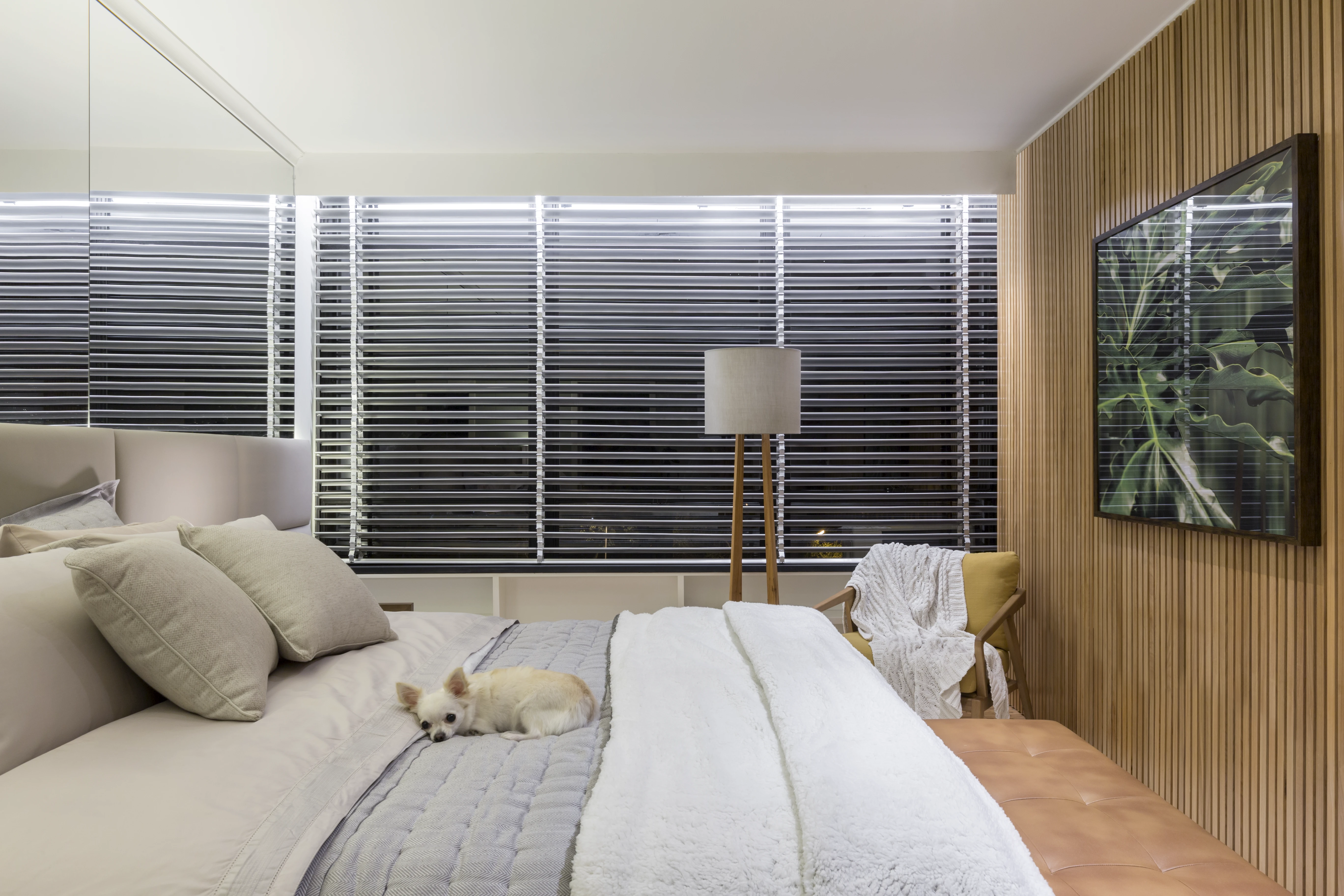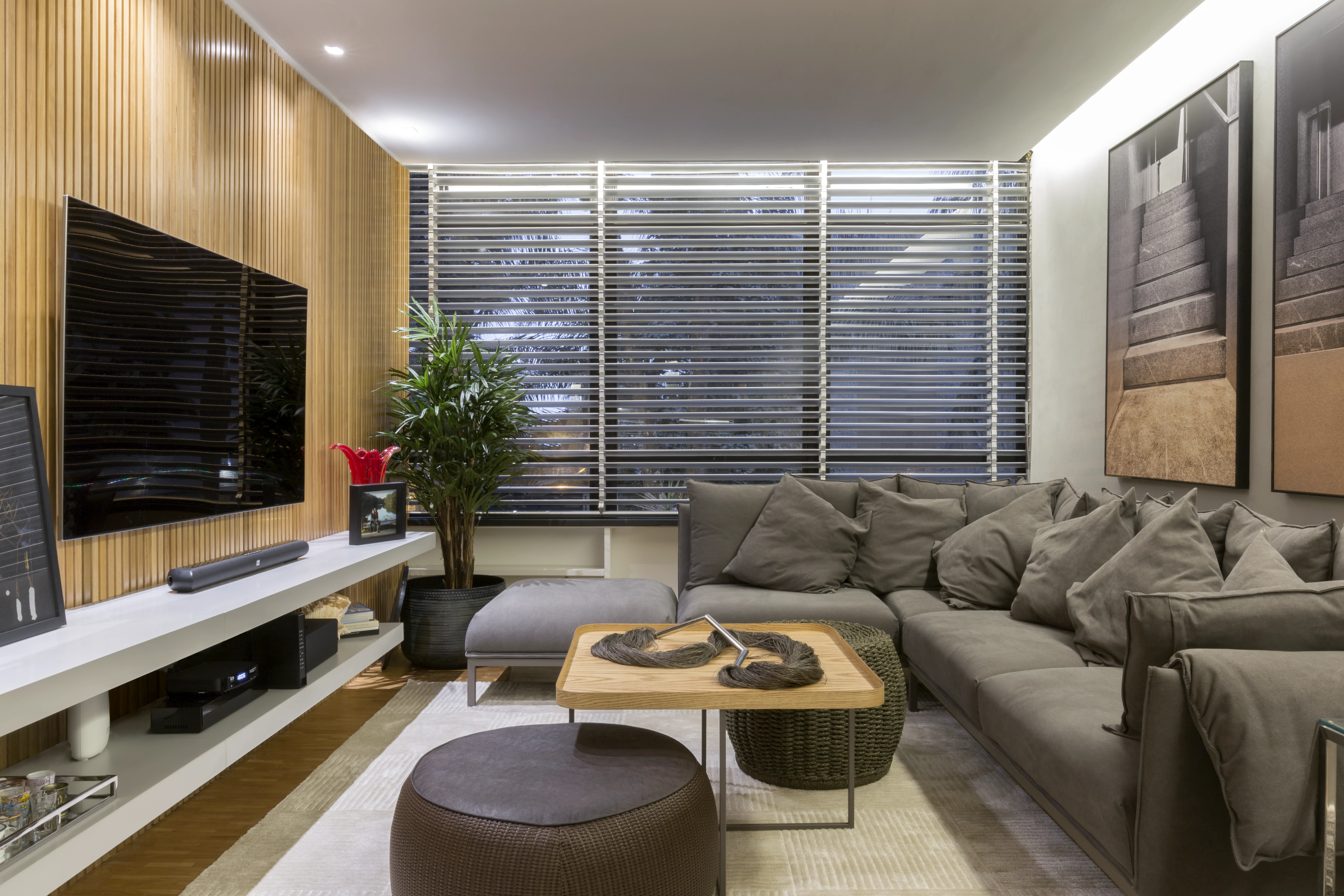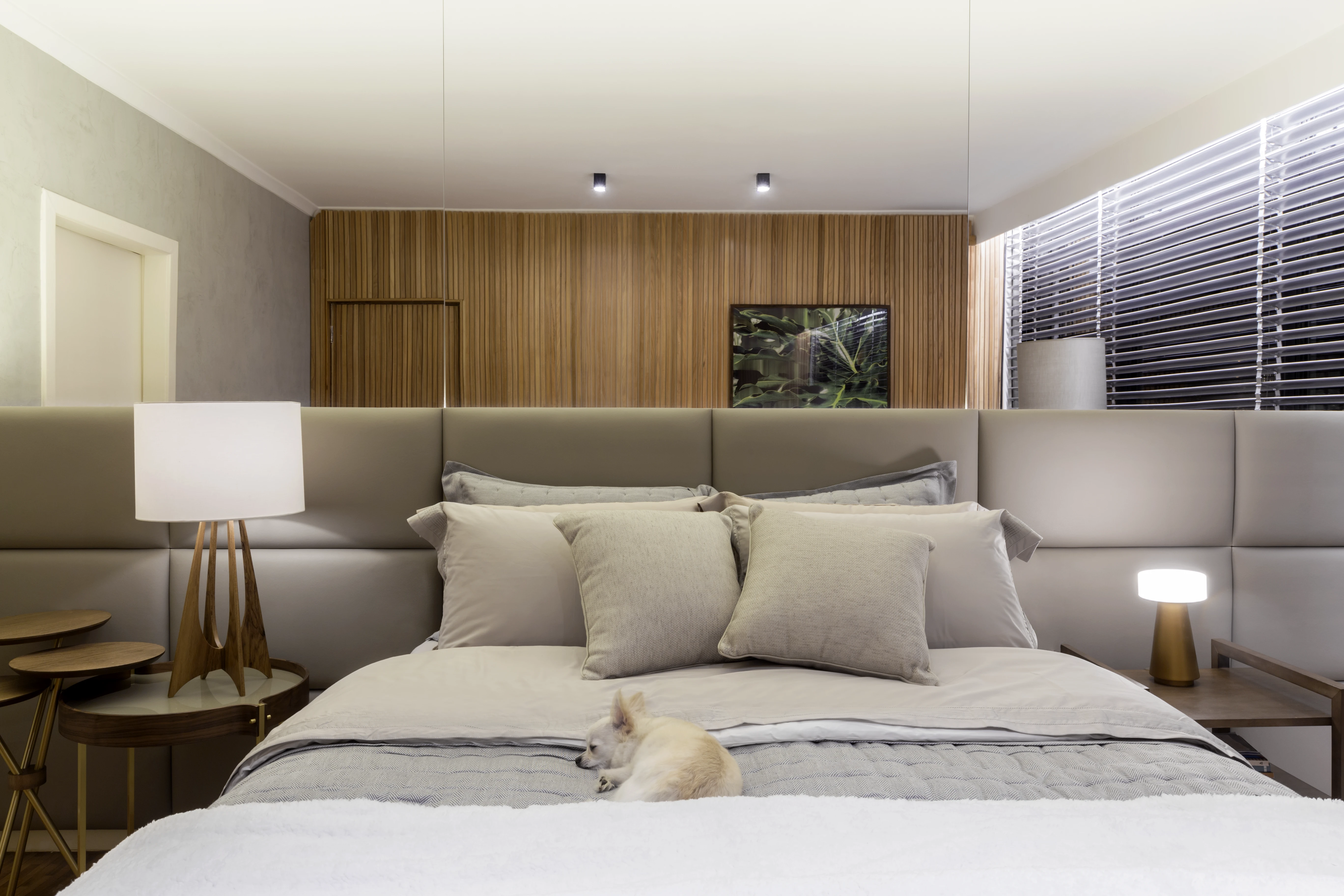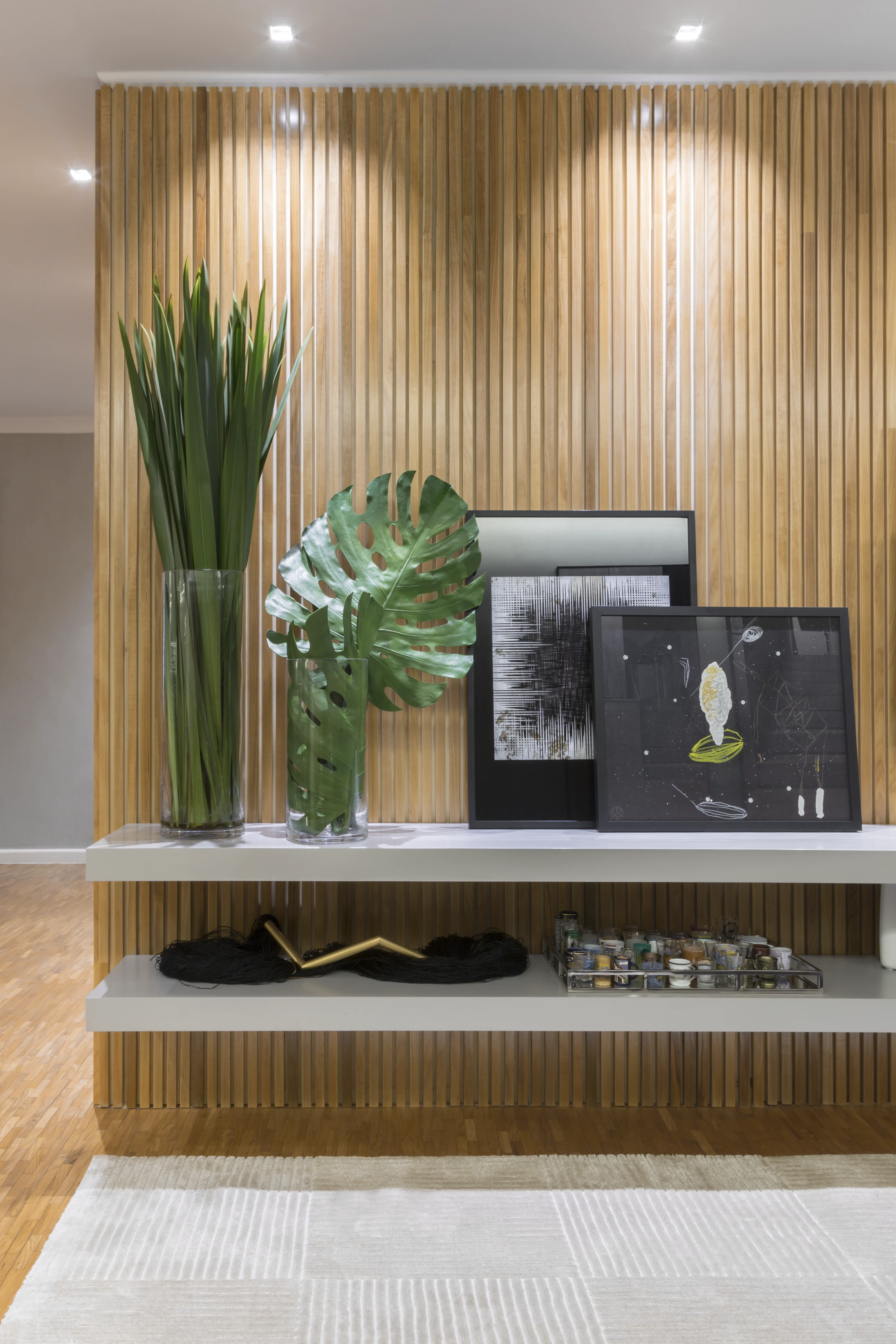 Na área social, a integração entre a sala de estar e a sala de jantar foi reforçada pela instalação de um painel de madeira ripada, criando uma sensação de continuidade anteriormente inexistente. O uso estratégico de espelhos foi fundamental para ampliar a perceção de espaço e luminosidade, servindo também para destacar peças de design, como a poltrona "Mole" de Sérgio Rodrigues, satisfazendo um desejo específico dos moradores.