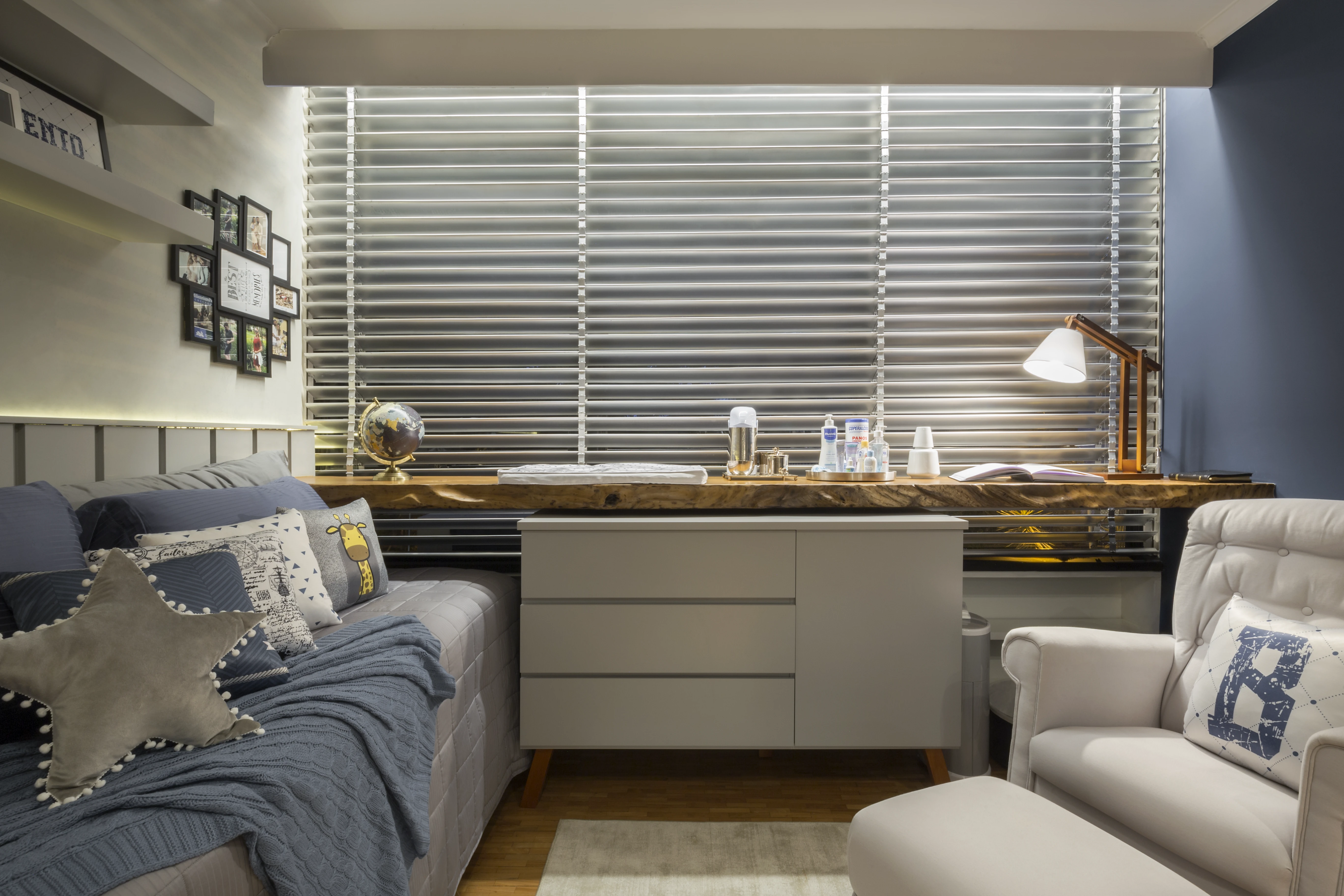 No quarto do bebé, a prioridade foi garantir a funcionalidade e a circulação, preservando áreas livres para além do mobiliário essencial como o berço e a cómoda. O recurso aos espelhos estendeu-se também à suíte principal, com uma aplicação sobre a cabeceira que confere profundidade ao ambiente, resultando num apartamento que alia a otimização de espaços pequenos a uma atmosfera sofisticada e acolhedora.