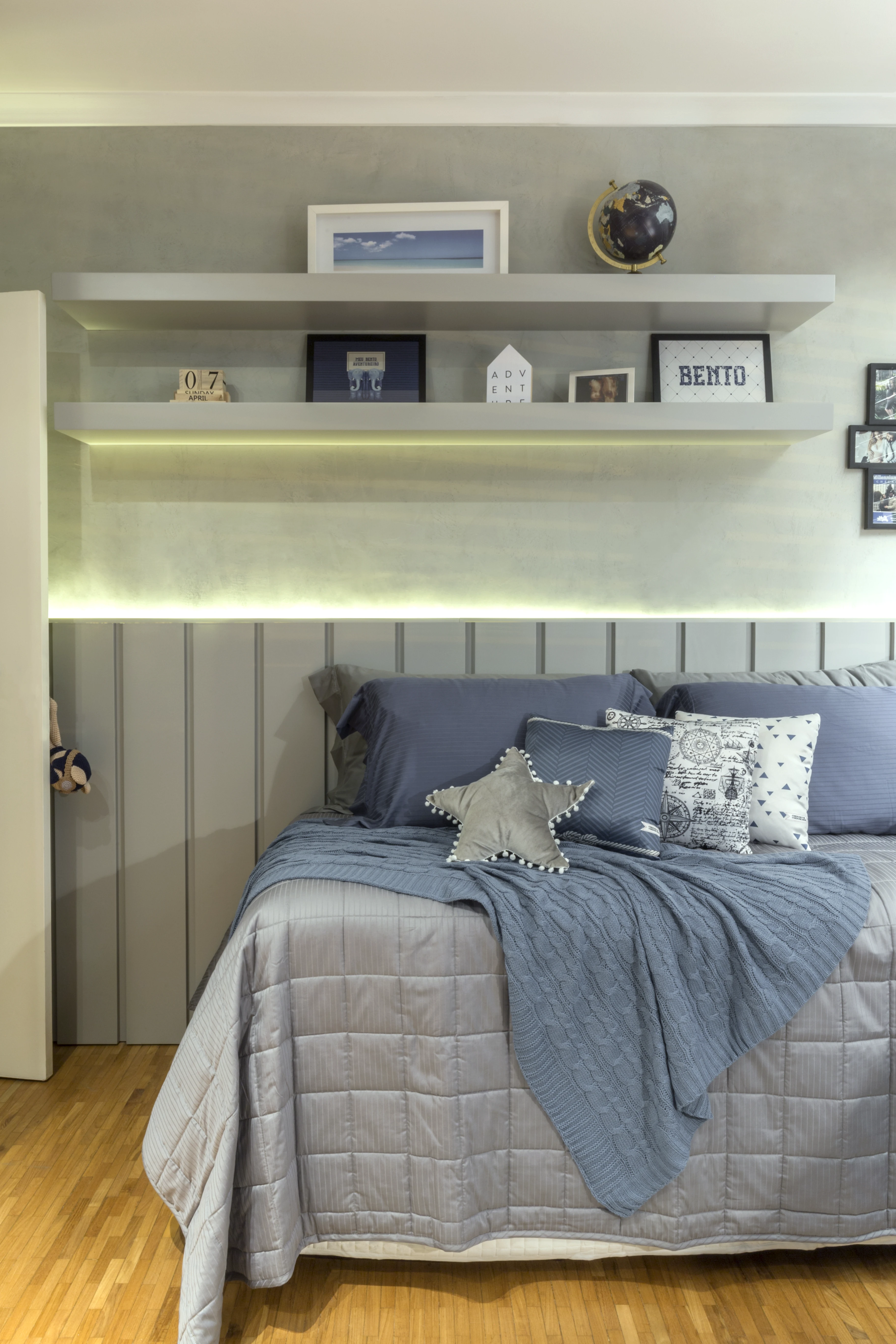 O projeto "Apartamento Monique e João" teve como ponto de partida a chegada de Bento, o primeiro filho de um casal de executivos, motivando uma reestruturação dos espaços para acolher o novo membro da família. A intervenção incluiu a remodelação da sala e do quarto do casal, bem como a transformação total do antigo escritório no quarto do bebé, adotando uma linguagem estética prática e aconchegante baseada em tons claros e no uso de madeira com diferentes texturas.