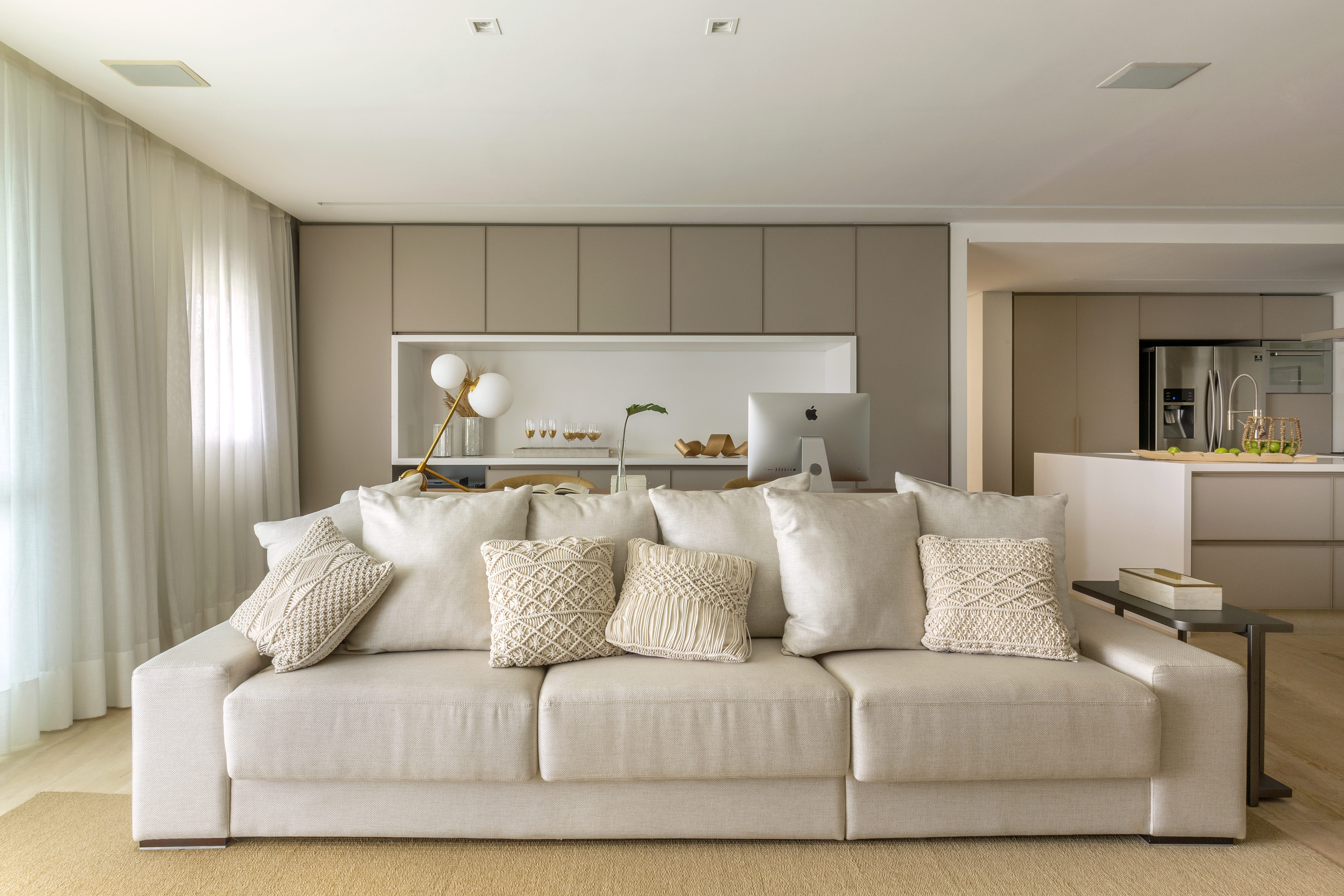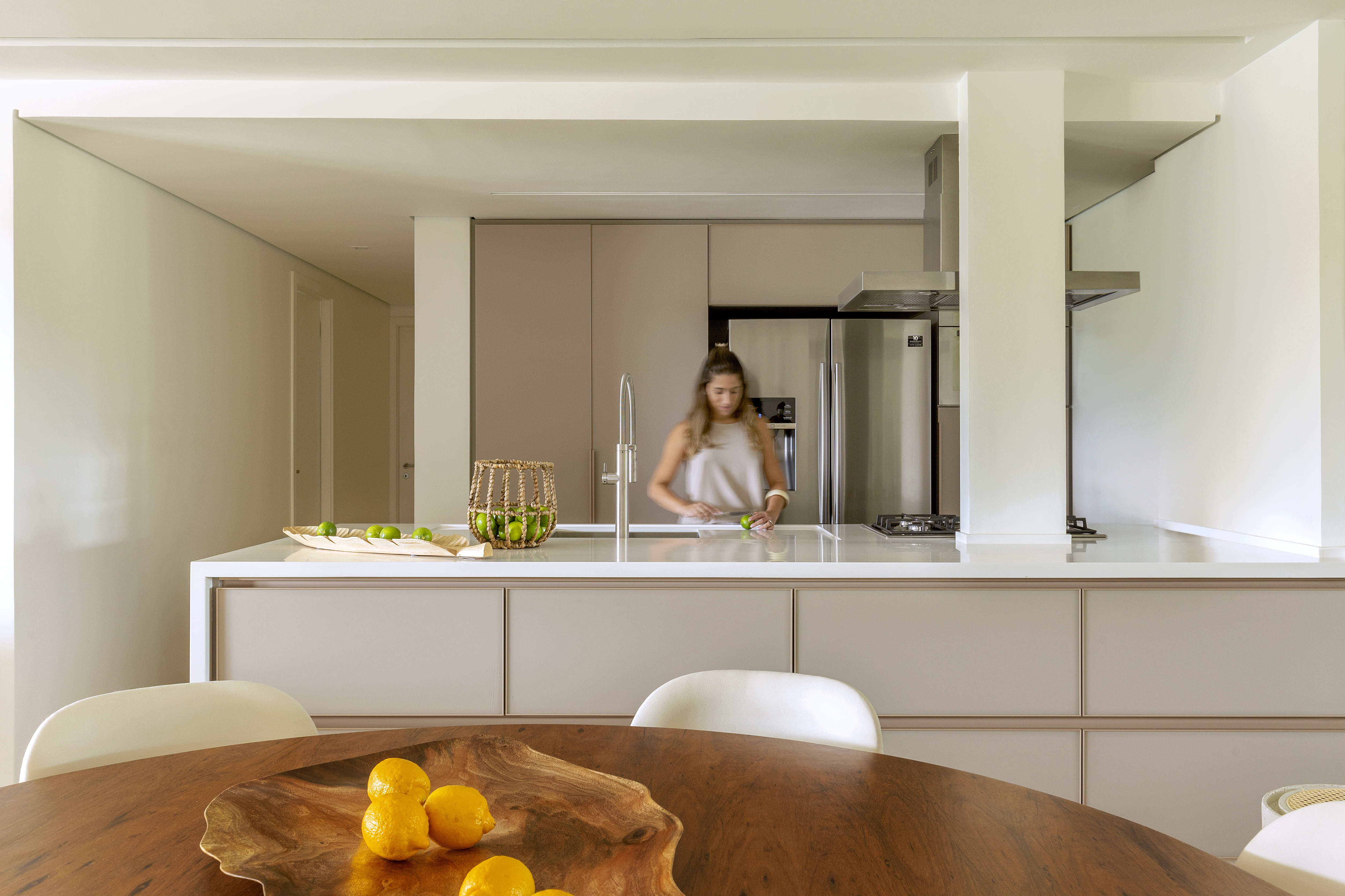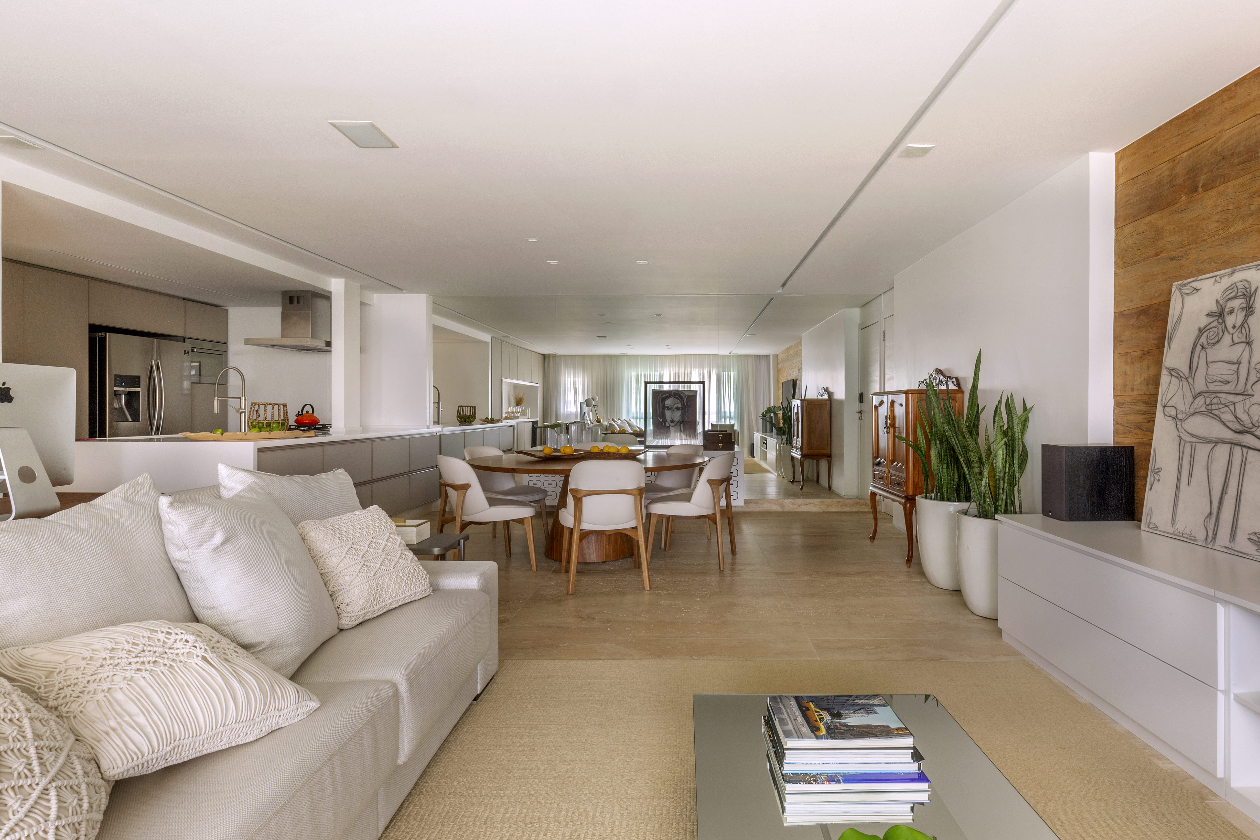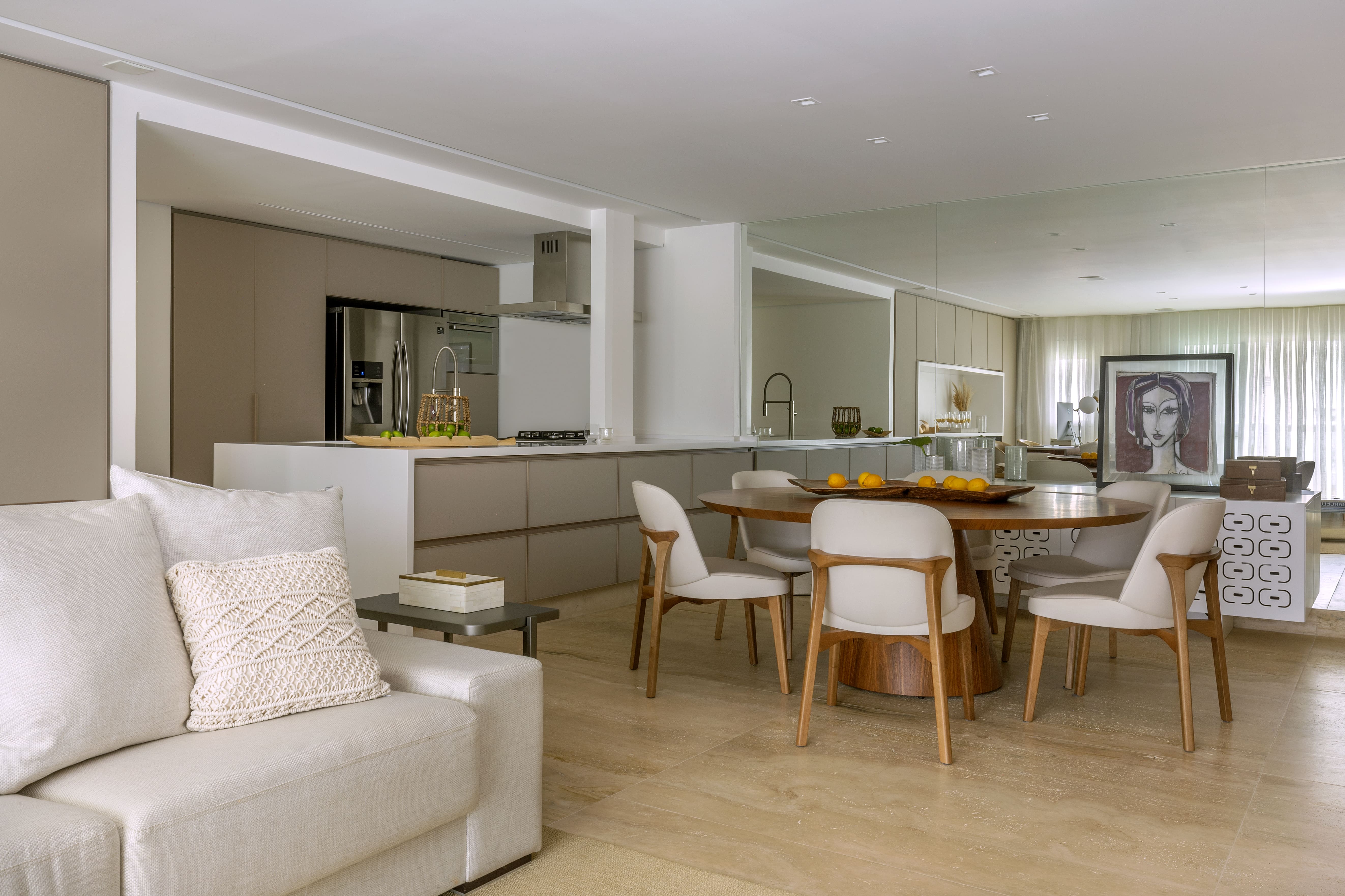 A decoração destaca-se pela curadoria afetiva, incorporando antigos objetos de família que ganham nova vida e destaque ao contrastarem com os revestimentos contemporâneos. Essa mistura entre o antigo e o novo resulta em um apartamento moderno, despojado e elegante, consolidando a atmosfera de uma morada verdadeiramente serena.