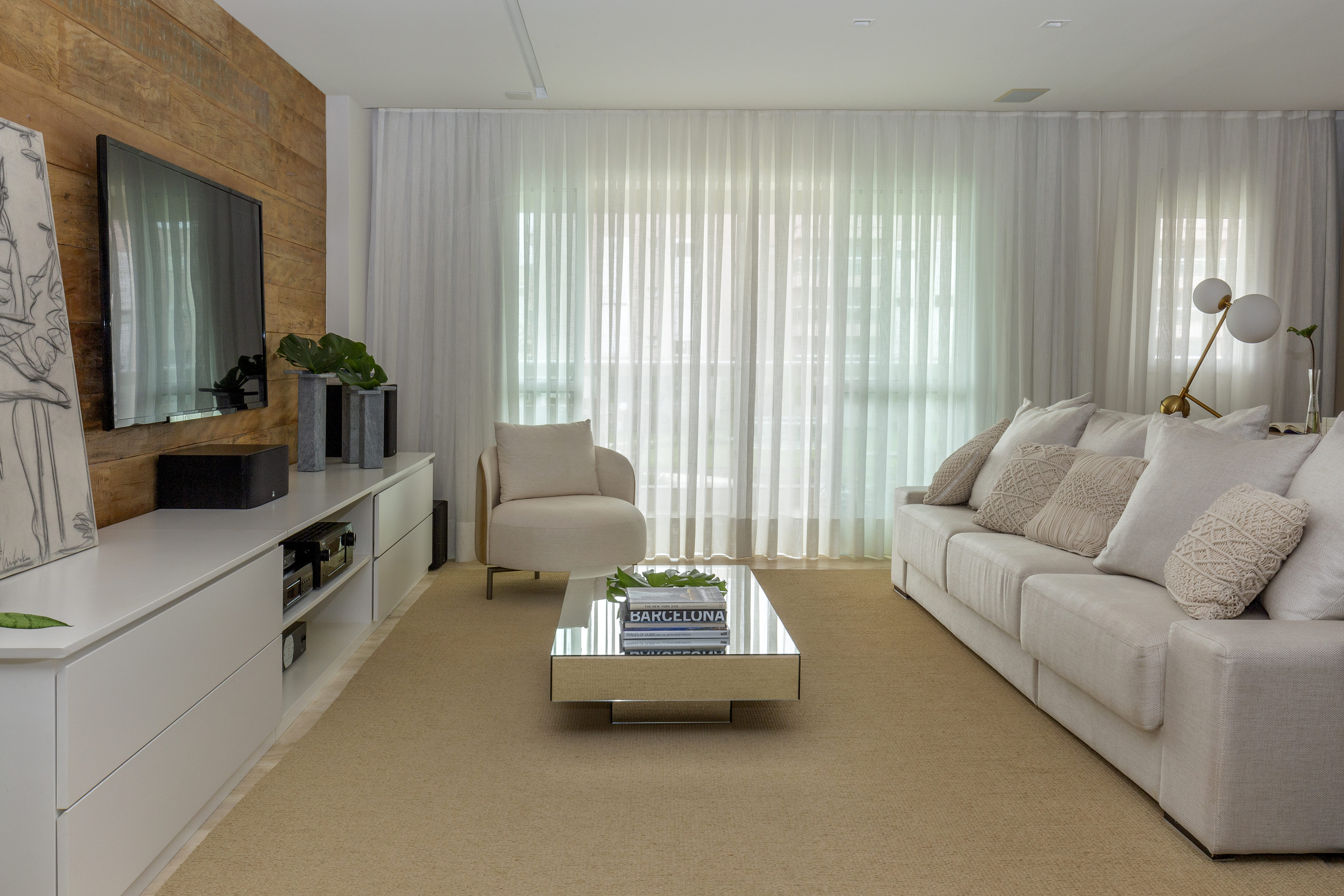 O projeto de interiores do Apartamento Serenara foi concebido para refletir a personalidade de uma mulher independente e de gosto refinado, priorizando a praticidade e o prazer de receber convidados. O layout promove a integração total entre as salas de estar, jantar, TV e a varanda, criando um espaço amplo e acolhedor que atende às atividades cotidianas da moradora, como a leitura e a gastronomia.