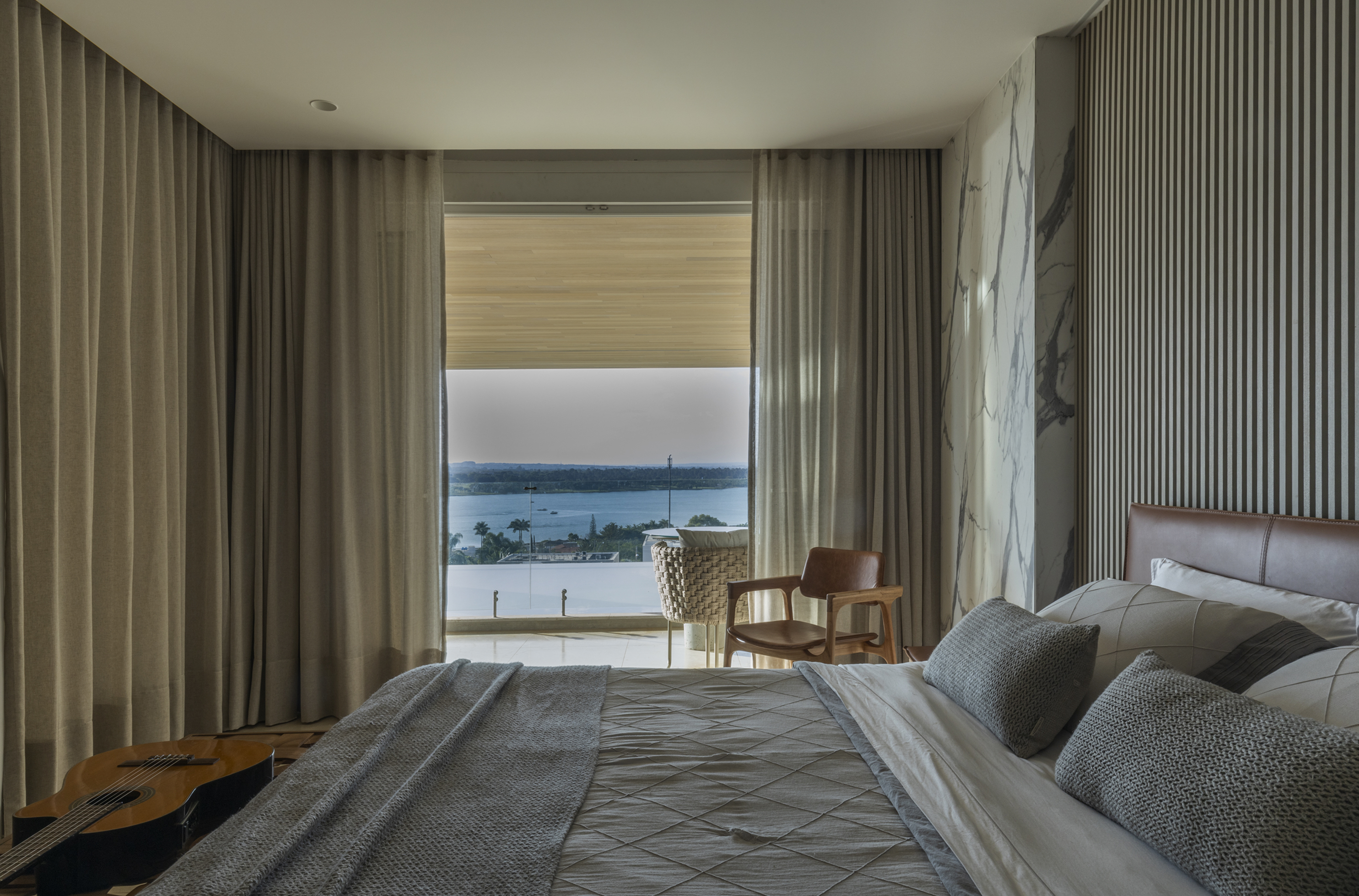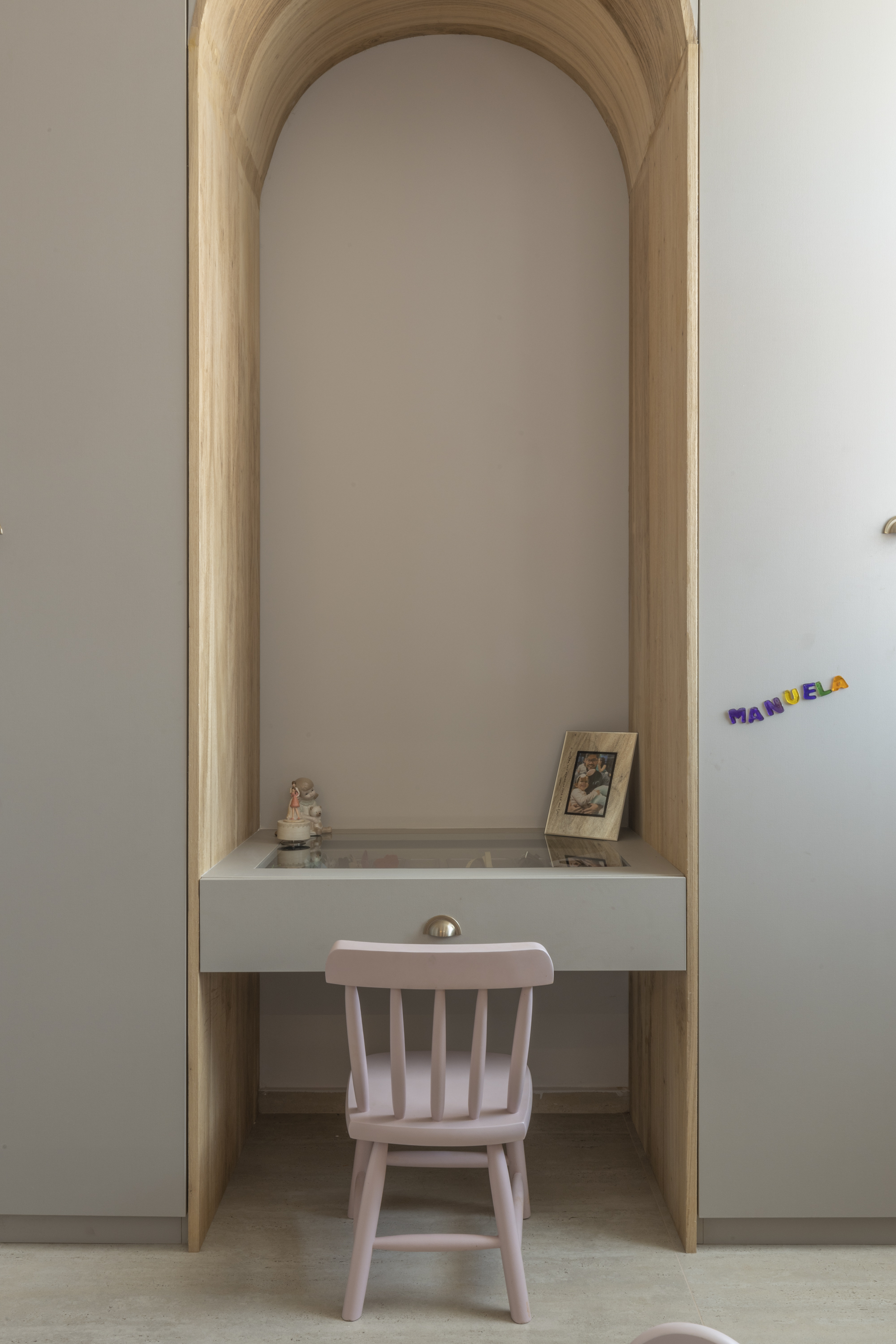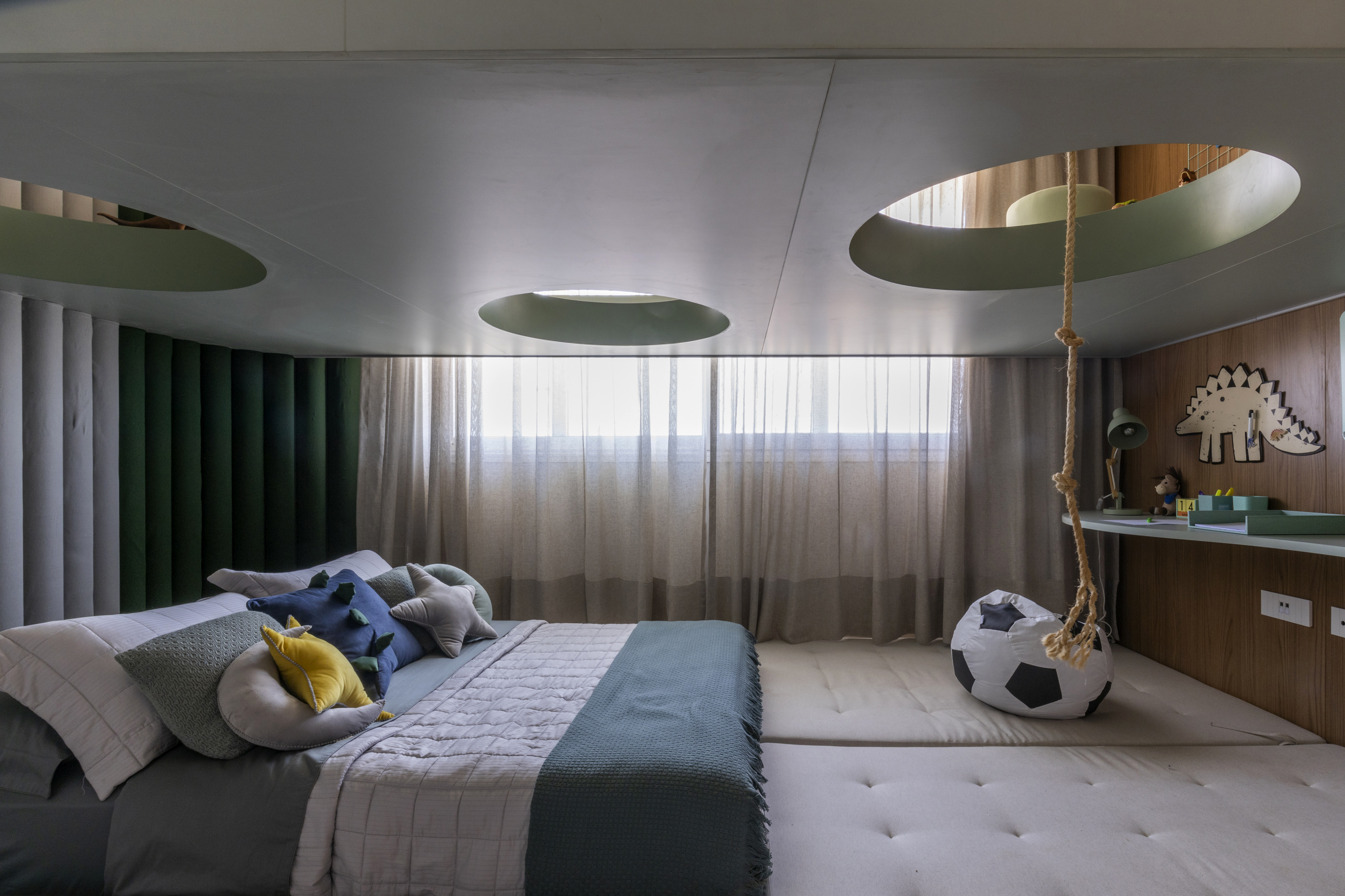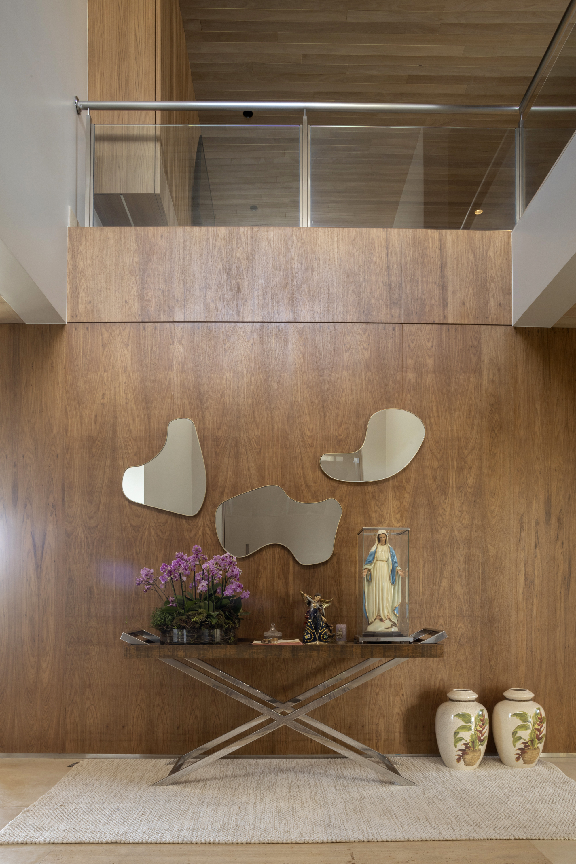 A área íntima preservou a maior parte de sua estrutura, com remoções pontuais de paredes para ampliar os espaços e a criação de uma sala multifuncional no hall de circulação. Além da personalização dos quartos conforme a identidade dos moradores, o projeto carrega um forte simbolismo: o espelho d'água suspenso atua como um local de oração e reflexão, conectando o céu à terra e representando a fé da cliente, conceito central no desenvolvimento da casa.