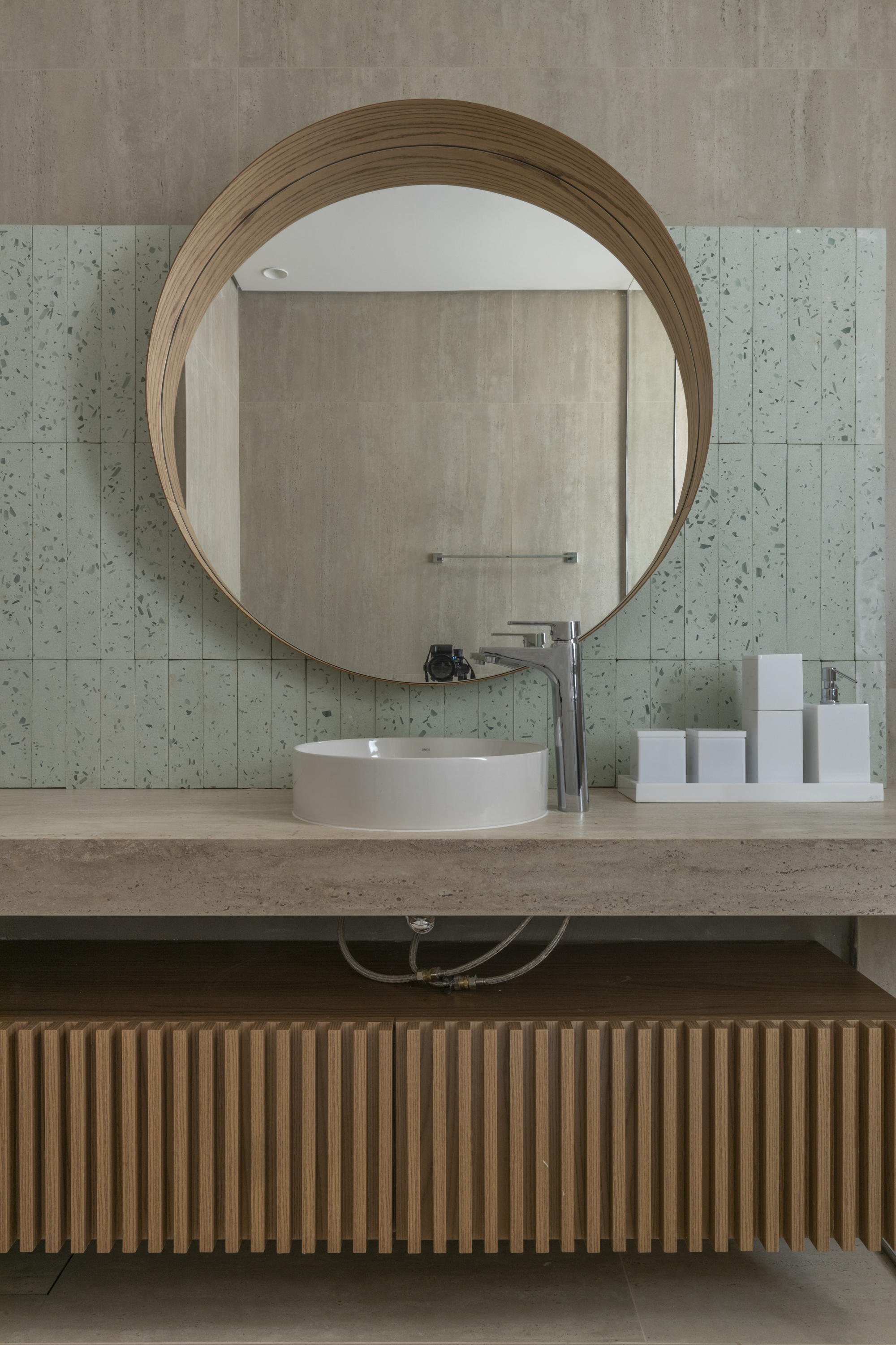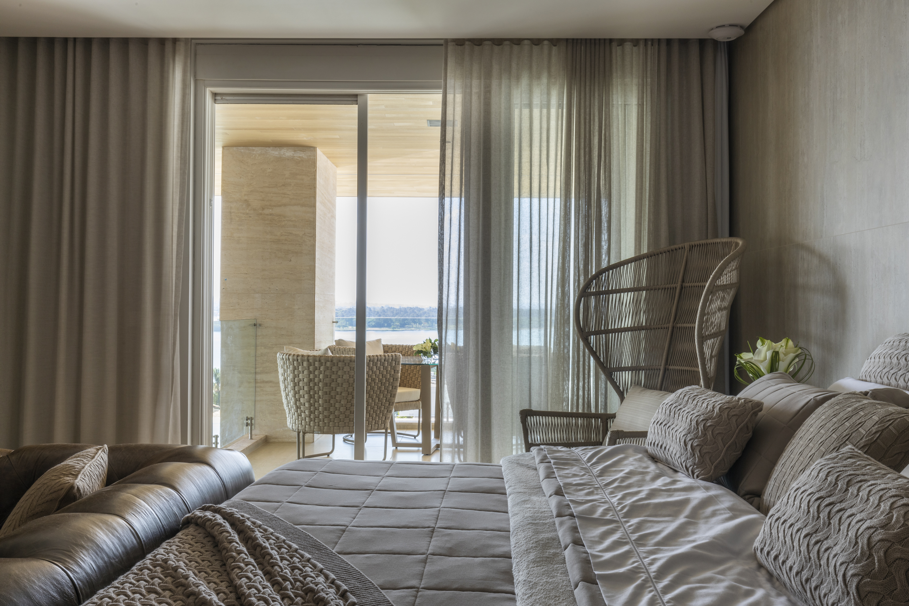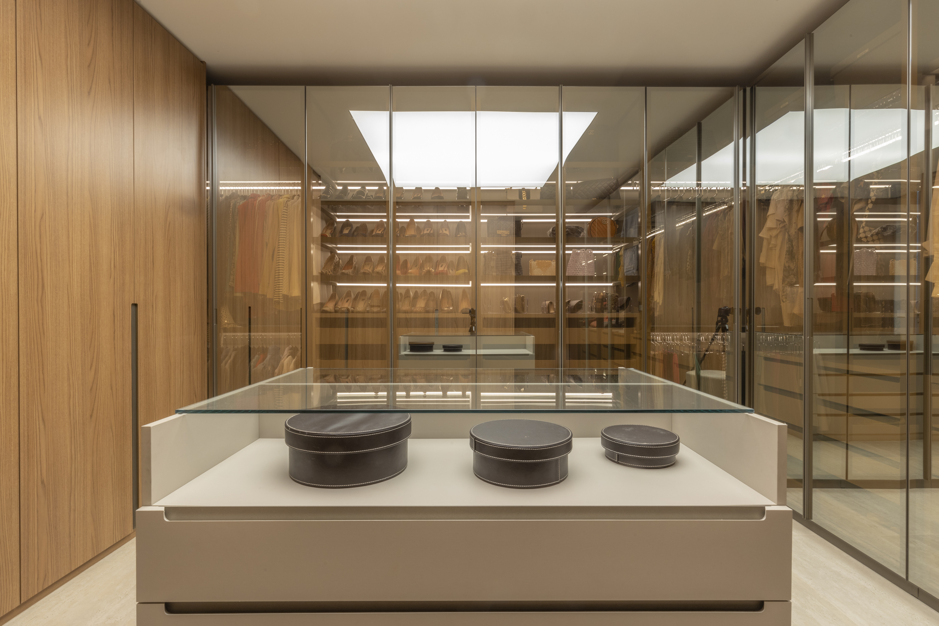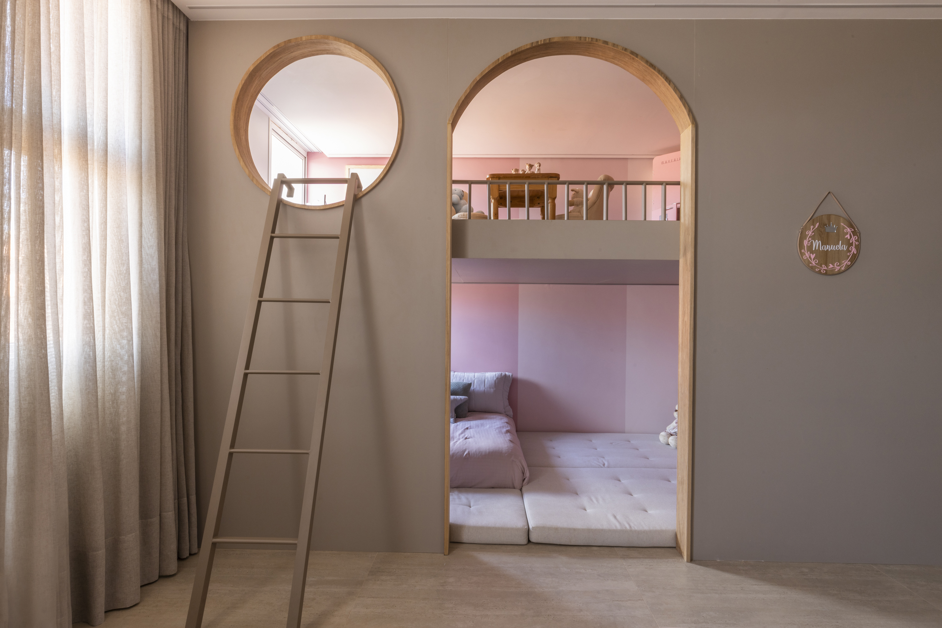 A área íntima preservou a maior parte de sua estrutura, com remoções pontuais de paredes para ampliar os espaços e a criação de uma sala multifuncional no hall de circulação. Além da personalização dos quartos conforme a identidade dos moradores, o projeto carrega um forte simbolismo: o espelho d'água suspenso atua como um local de oração e reflexão, conectando o céu à terra e representando a fé da cliente, conceito central no desenvolvimento da casa.