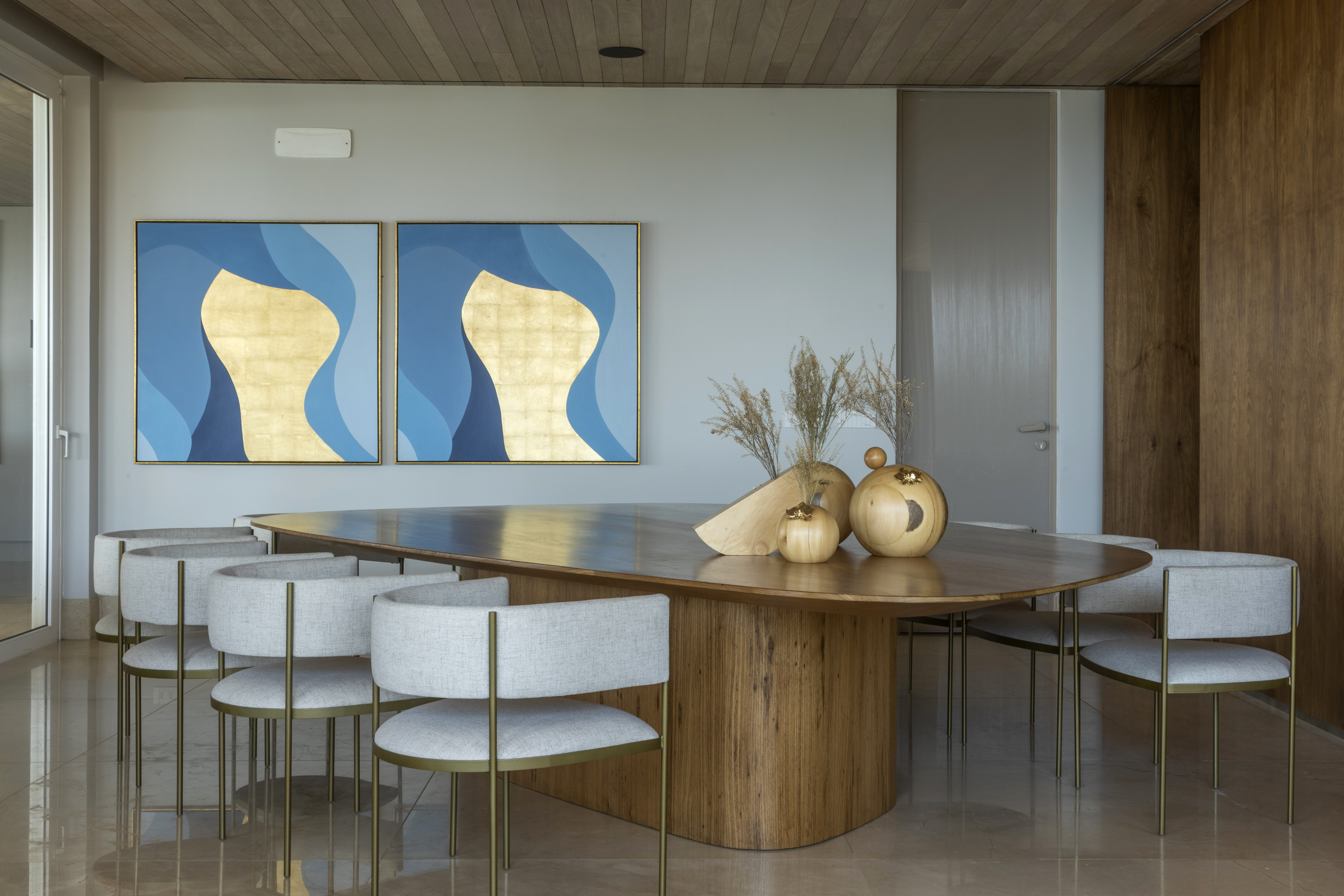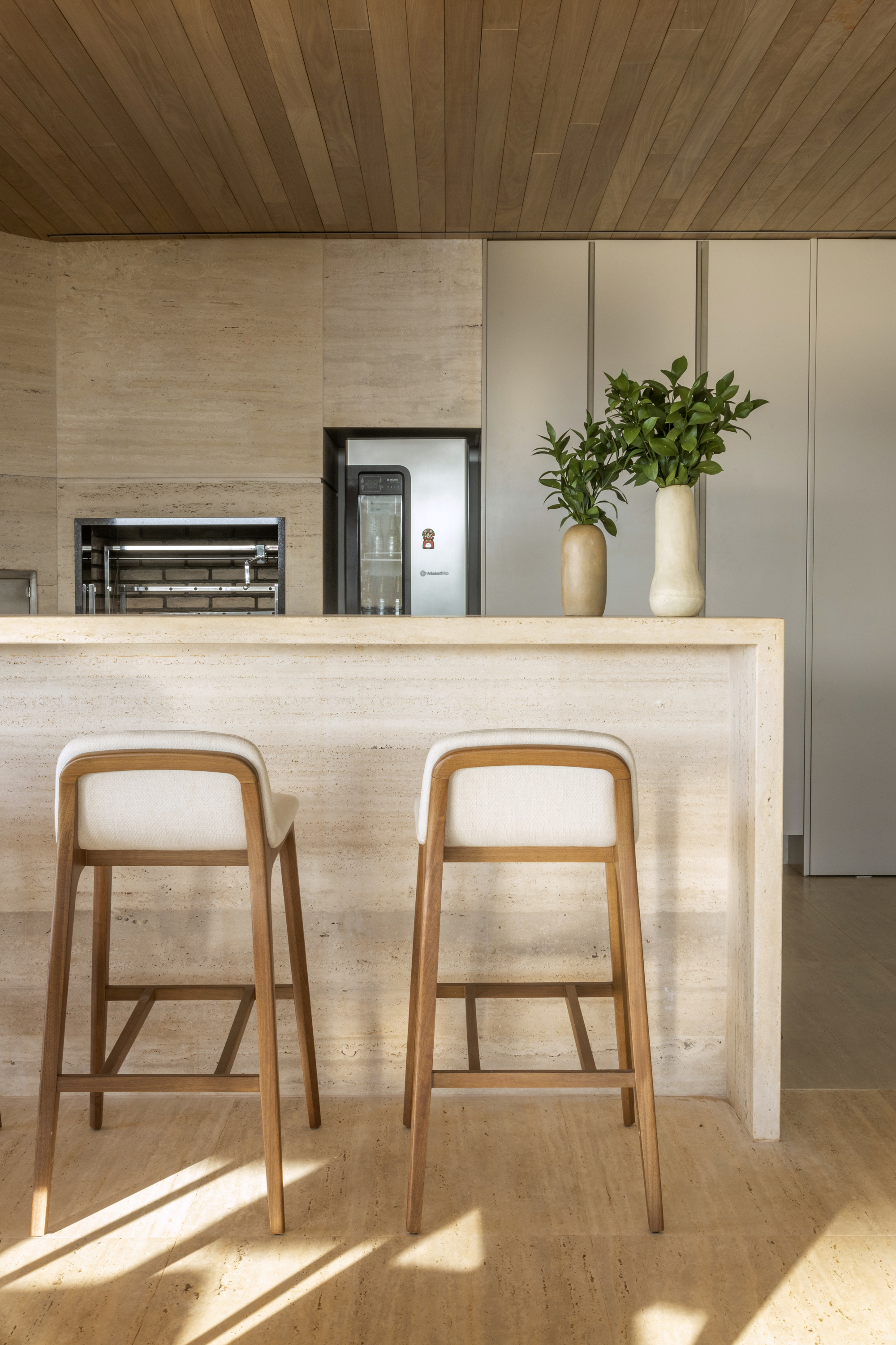 No que tange às áreas de convivência e lazer, a reestruturação focou na integração e na fluidez dos espaços. As paredes do térreo foram removidas para unificar as salas de jantar e estar, sendo a sala de TV o único volume separado, embora possua portas de correr que permitem sua integração com o restante da casa. Externamente, a piscina foi redesenhada com linhas mais objetivas, e a cobertura da sauna foi ampliada para abrigar também uma academia e um salão de jogos.