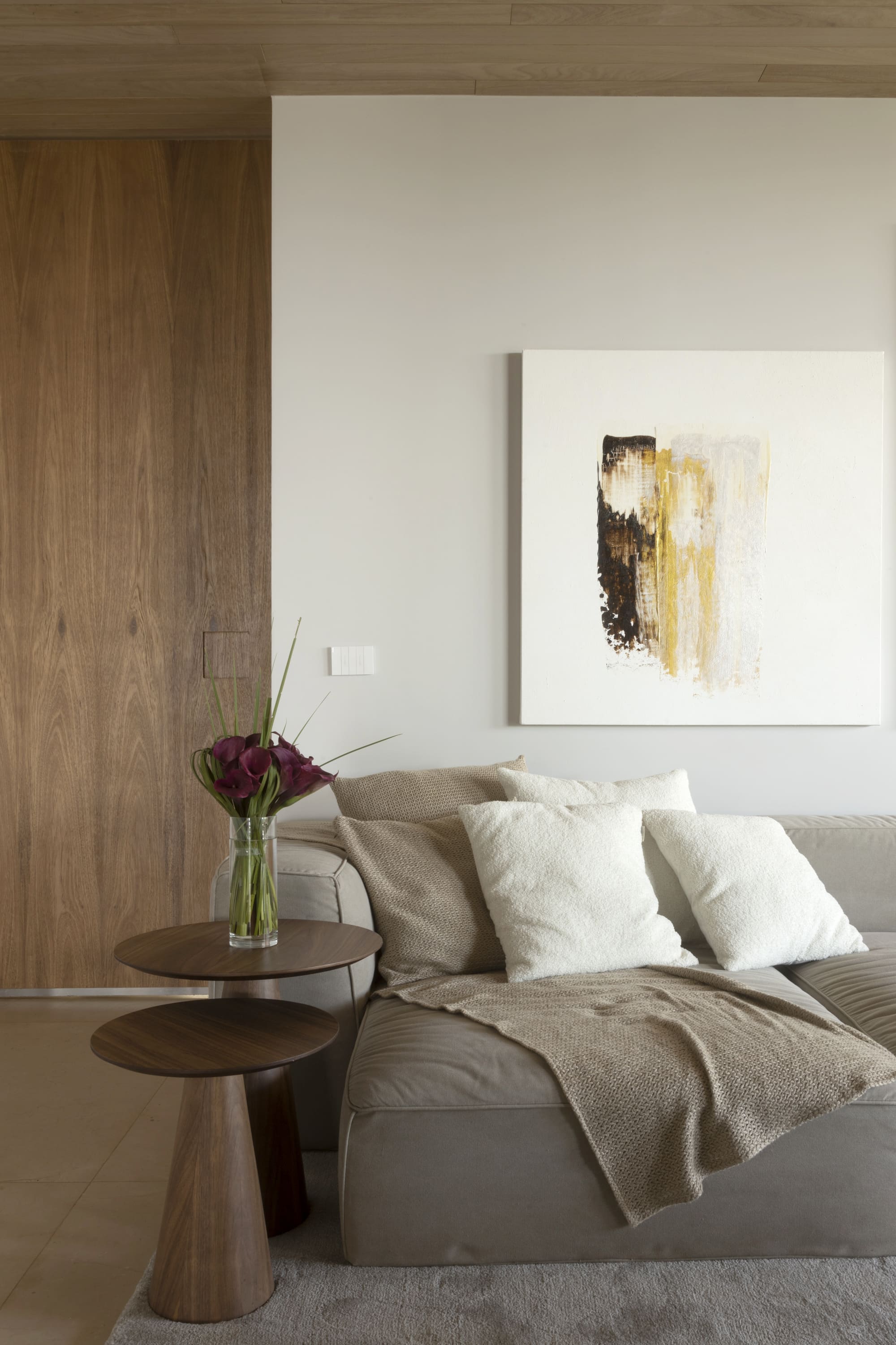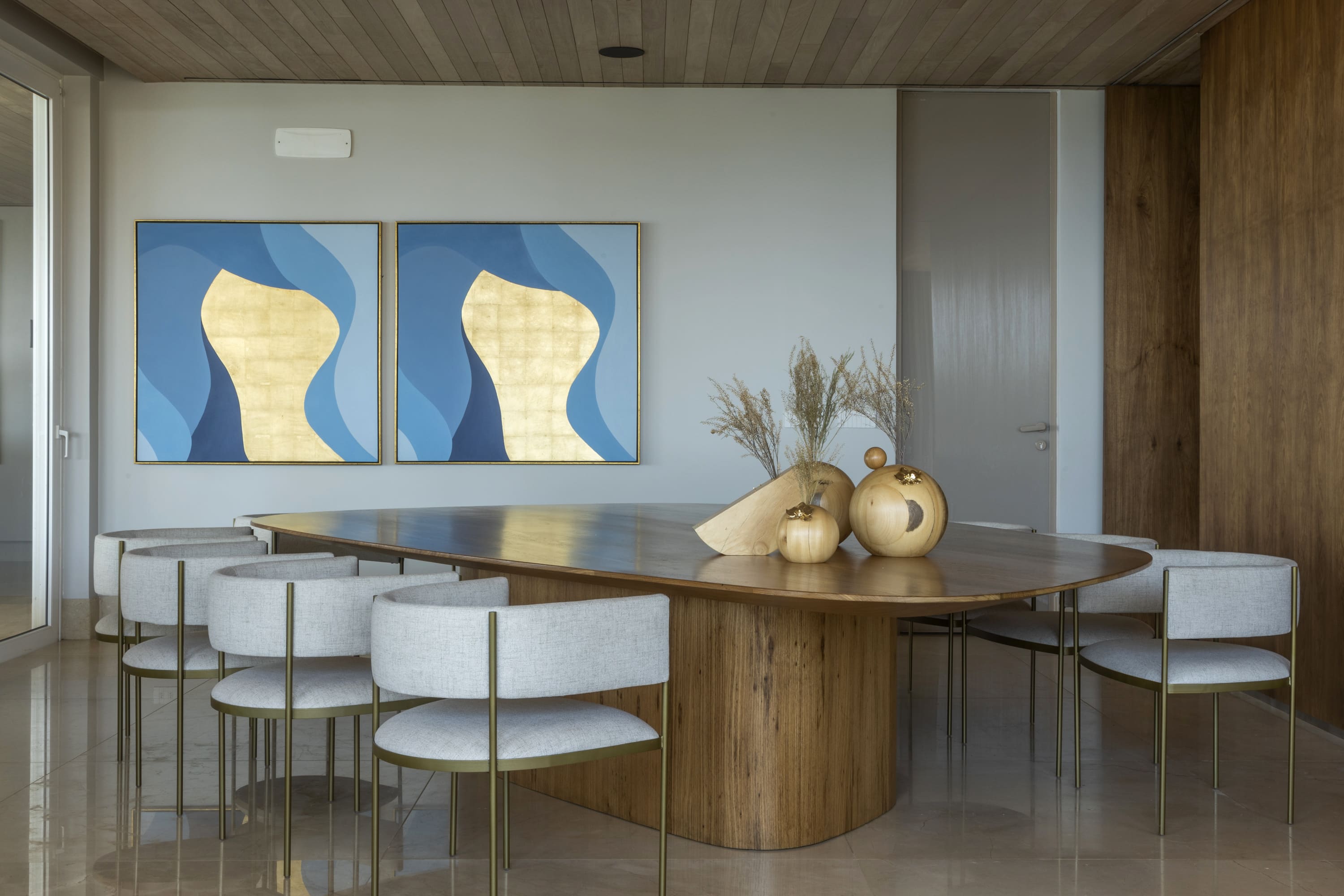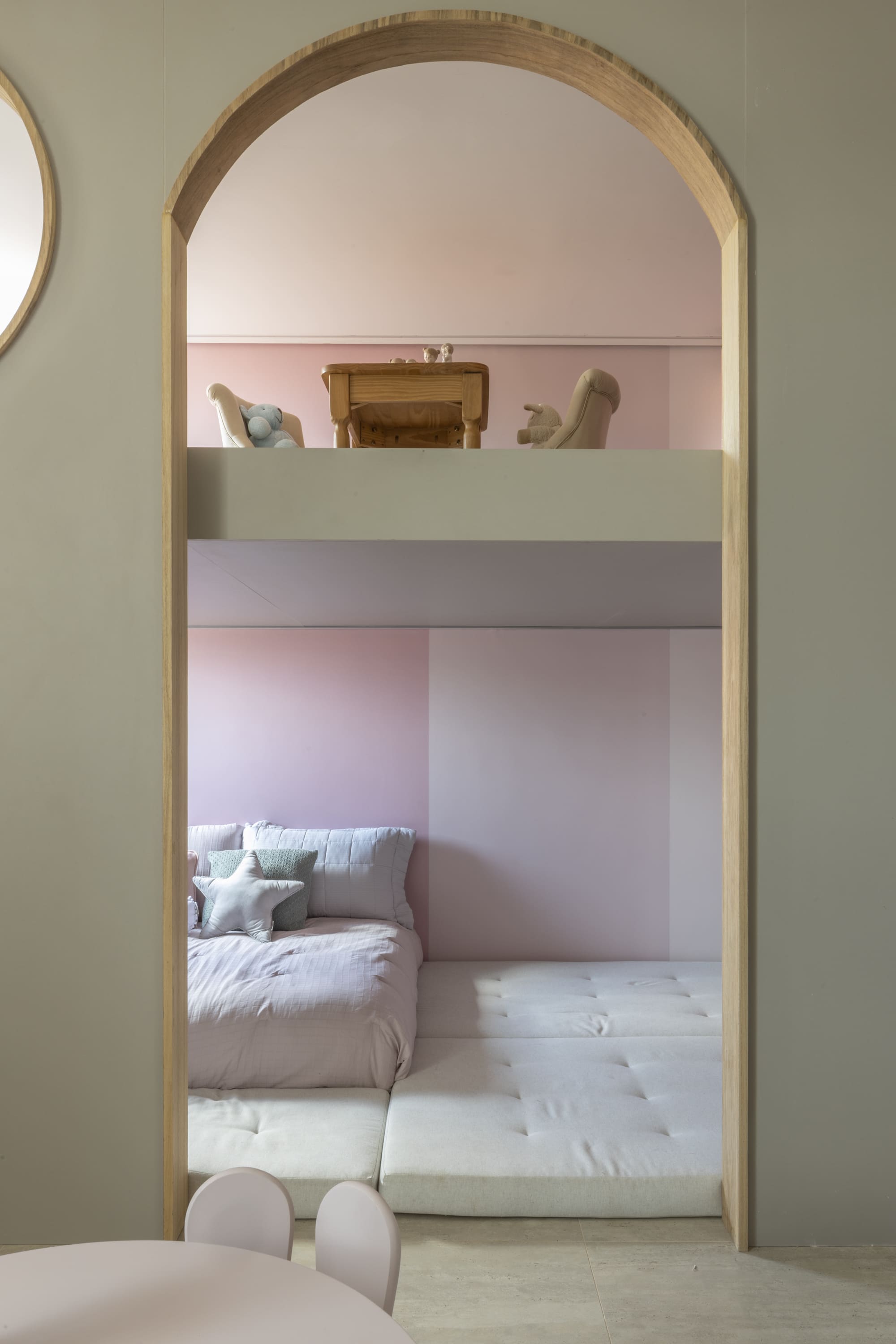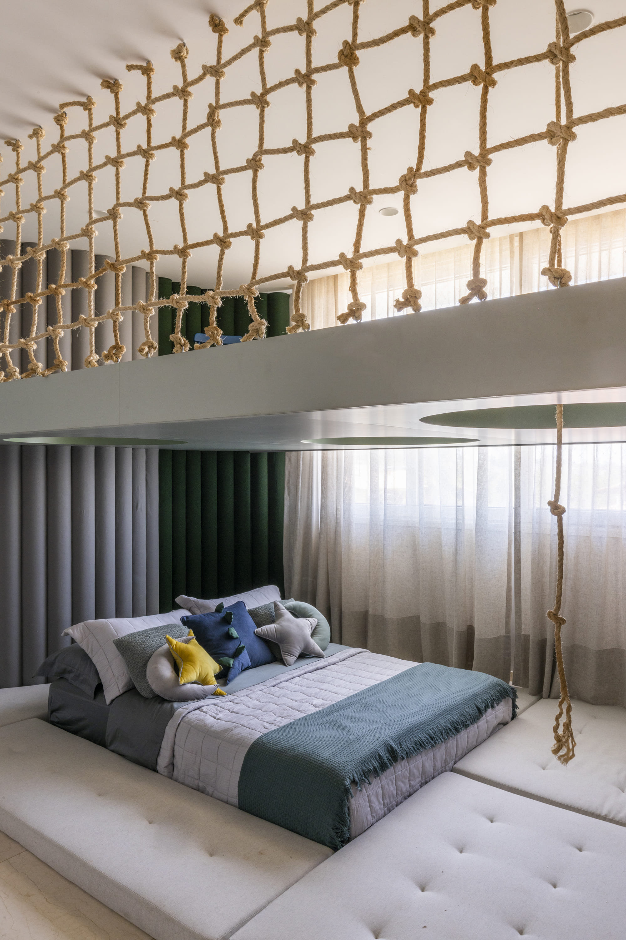 A área íntima preservou a maior parte de sua estrutura, com remoções pontuais de paredes para ampliar os espaços e a criação de uma sala multifuncional no hall de circulação. Além da personalização dos quartos conforme a identidade dos moradores, o projeto carrega um forte simbolismo: o espelho d'água suspenso atua como um local de oração e reflexão, conectando o céu à terra e representando a fé da cliente, conceito central no desenvolvimento da casa.