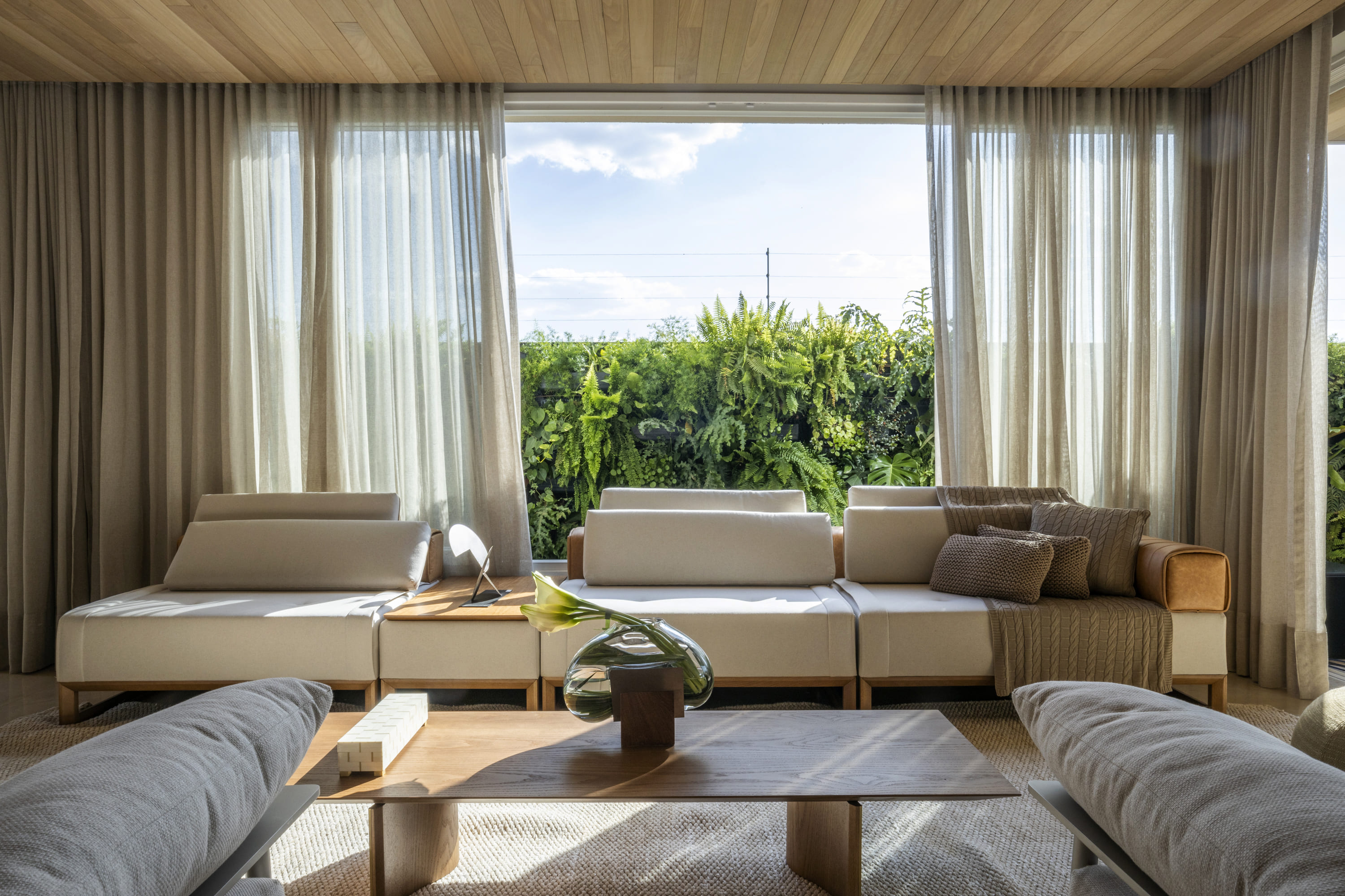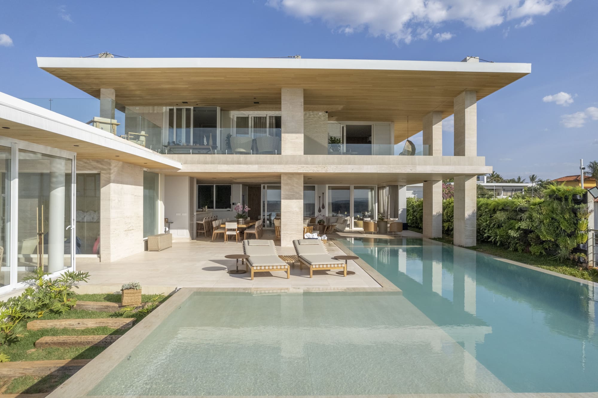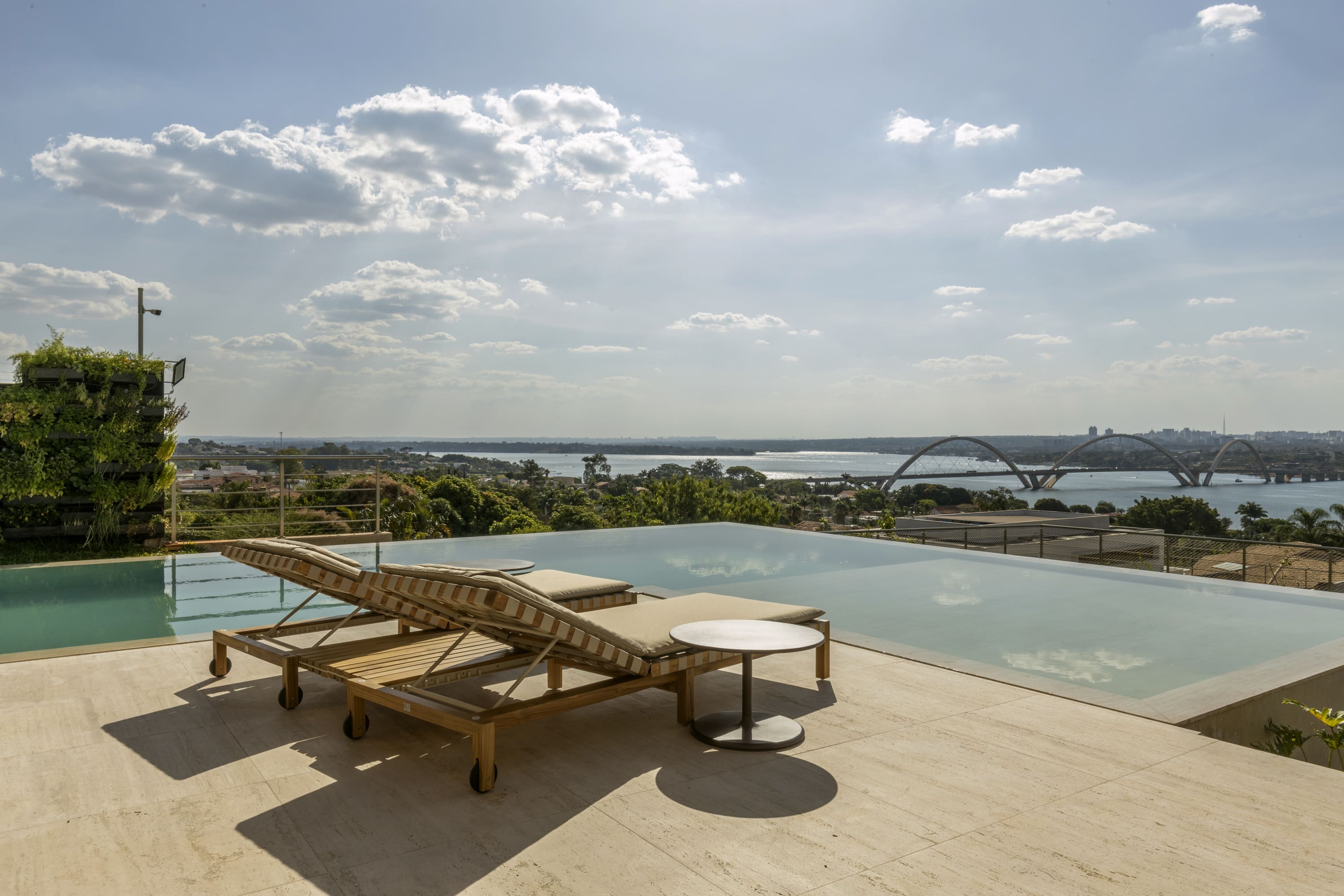 Localizada em um bairro nobre de Brasília com vista para o Lago Paranoá, a Casa Santuário é fruto de uma reforma que adotou uma abordagem minimalista para limpar a linguagem visual da construção original. O projeto enfrentou o desafio de controlar a incidência solar direta nas áreas sociais sem bloquear a paisagem, solucionando a questão através da criação de um espelho d'água suspenso. Este elemento funciona como extensão do beiral, protegendo o pavimento térreo e gerando um microclima mais agradável para as suítes superiores.