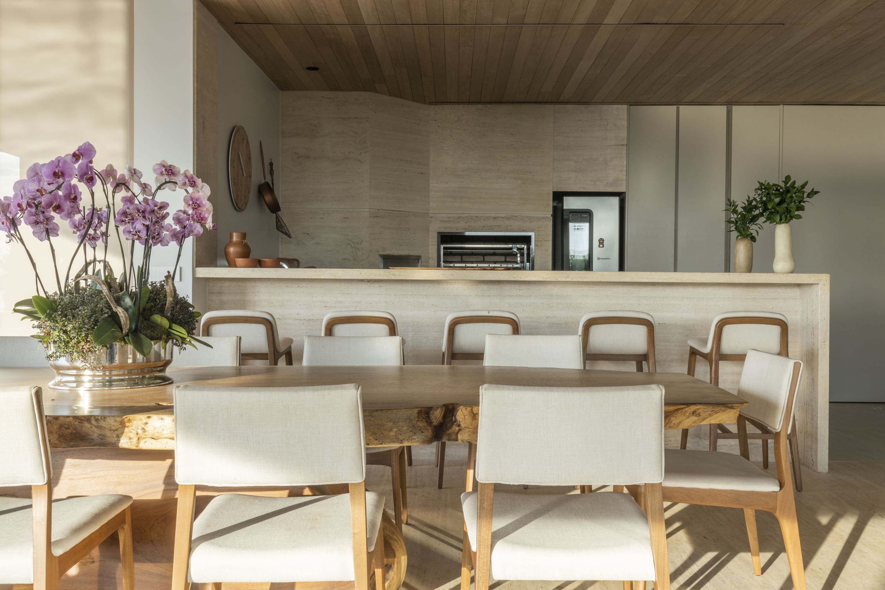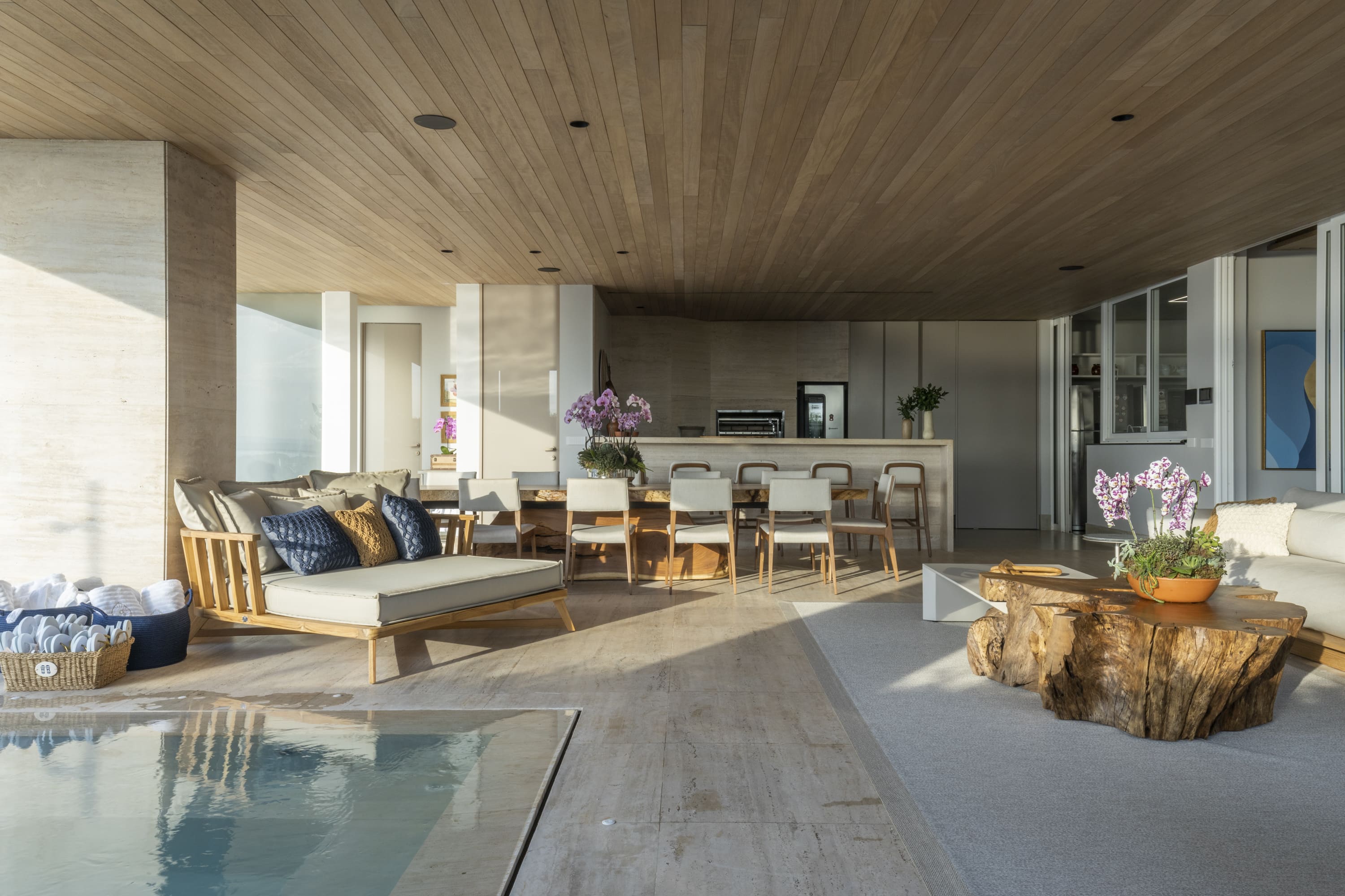 No que tange às áreas de convivência e lazer, a reestruturação focou na integração e na fluidez dos espaços. As paredes do térreo foram removidas para unificar as salas de jantar e estar, sendo a sala de TV o único volume separado, embora possua portas de correr que permitem sua integração com o restante da casa. Externamente, a piscina foi redesenhada com linhas mais objetivas, e a cobertura da sauna foi ampliada para abrigar também uma academia e um salão de jogos.