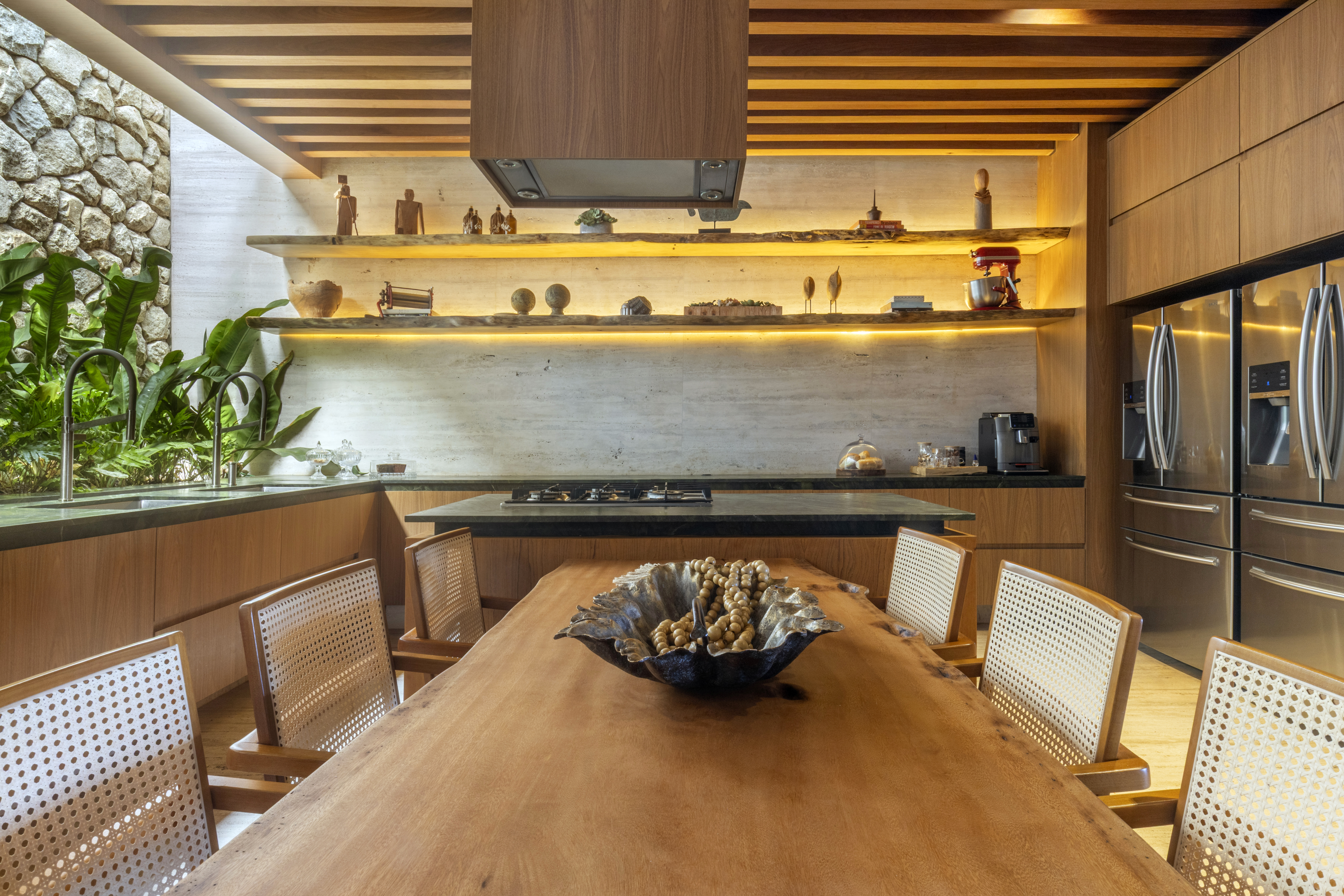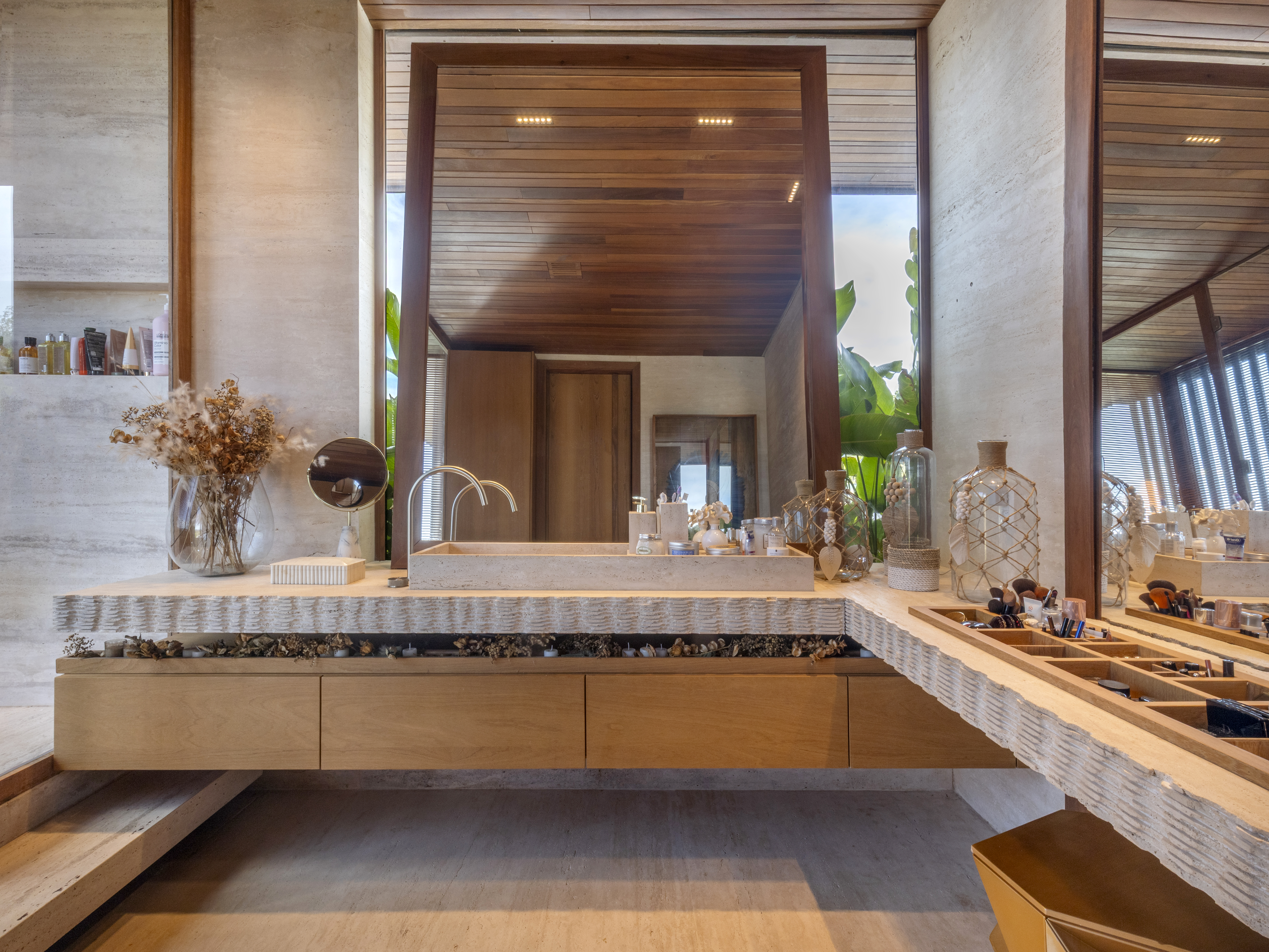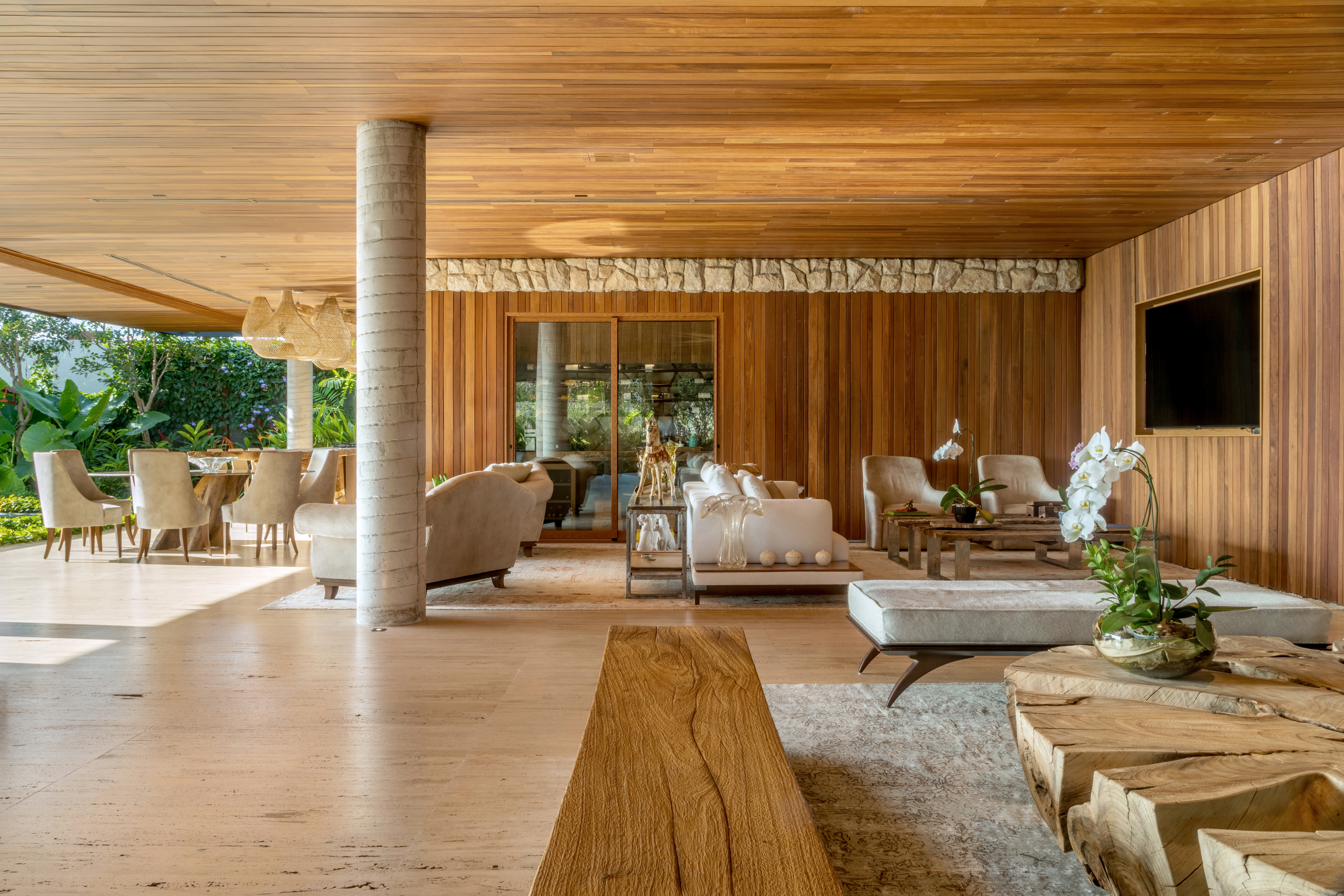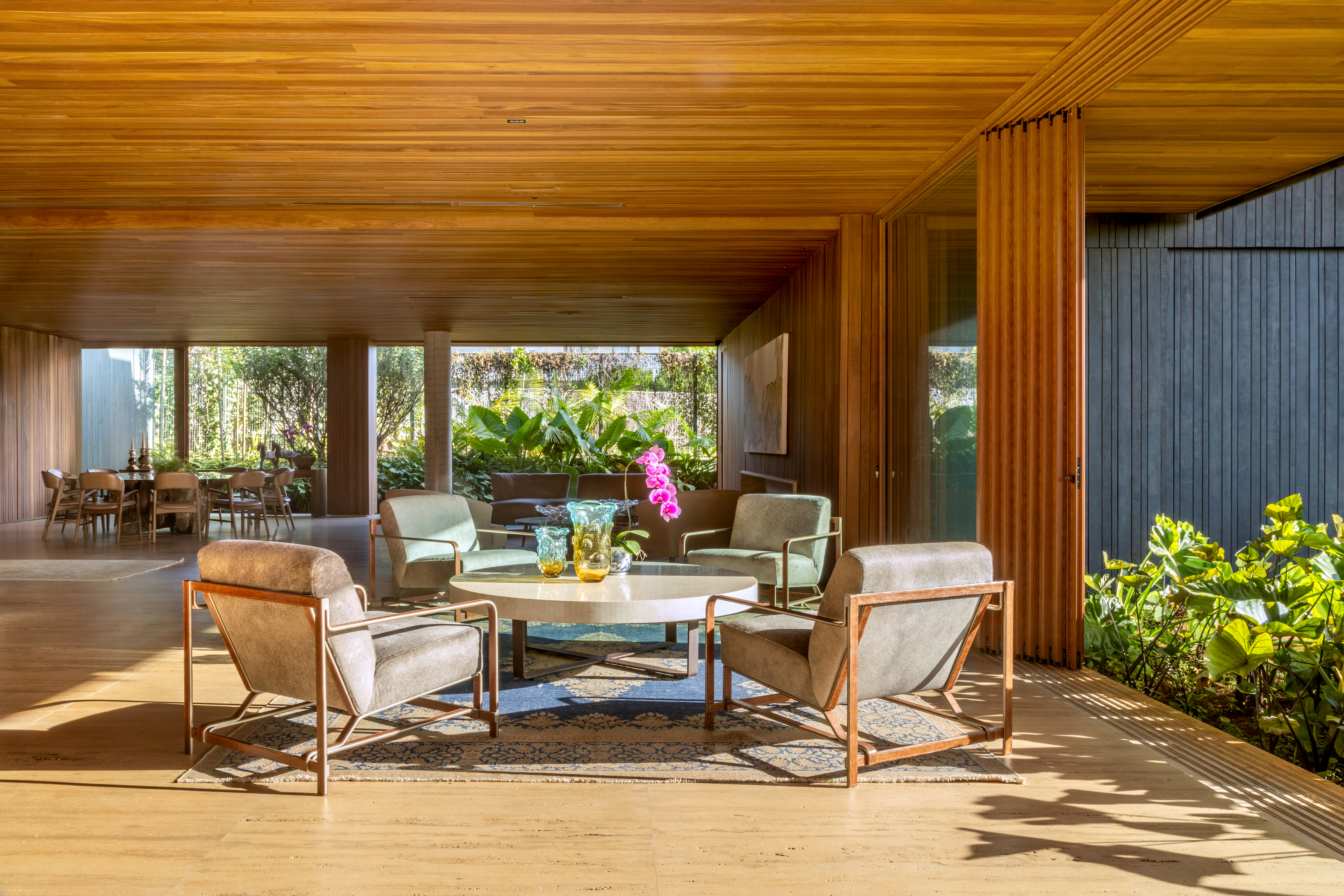 Os espaços sociais se abrem generosamente para fora, garantindo amplitude, luz e fluidez, ao mesmo tempo em que respondem à intensa incidência solar. A integração entre arquitetura, interiores e paisagismo se traduz em grandes planos de vidro combinados a brises, jardins, espelhos d’água e vegetação que atravessa a casa, equilibrando conforto térmico e conexão com a natureza.
