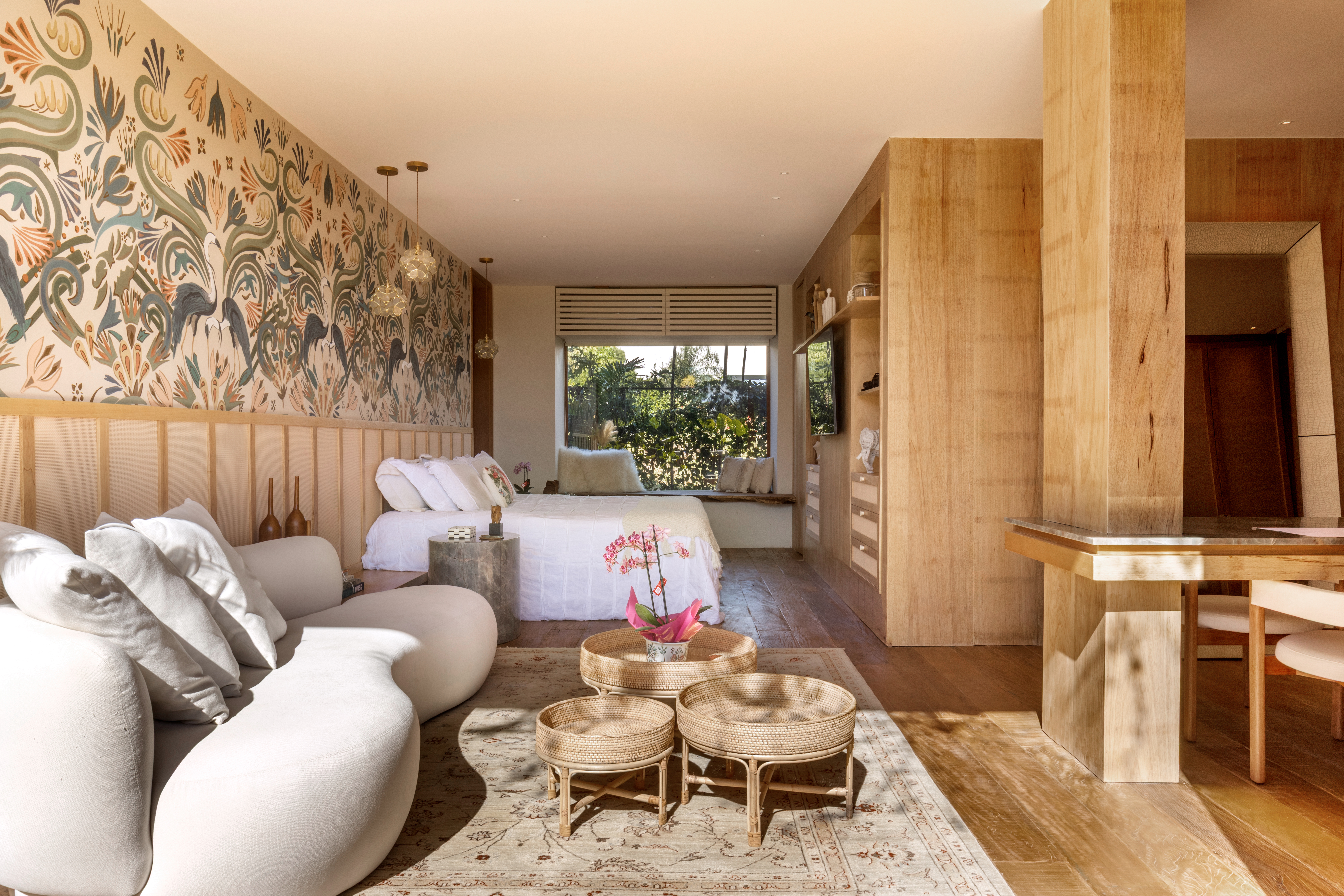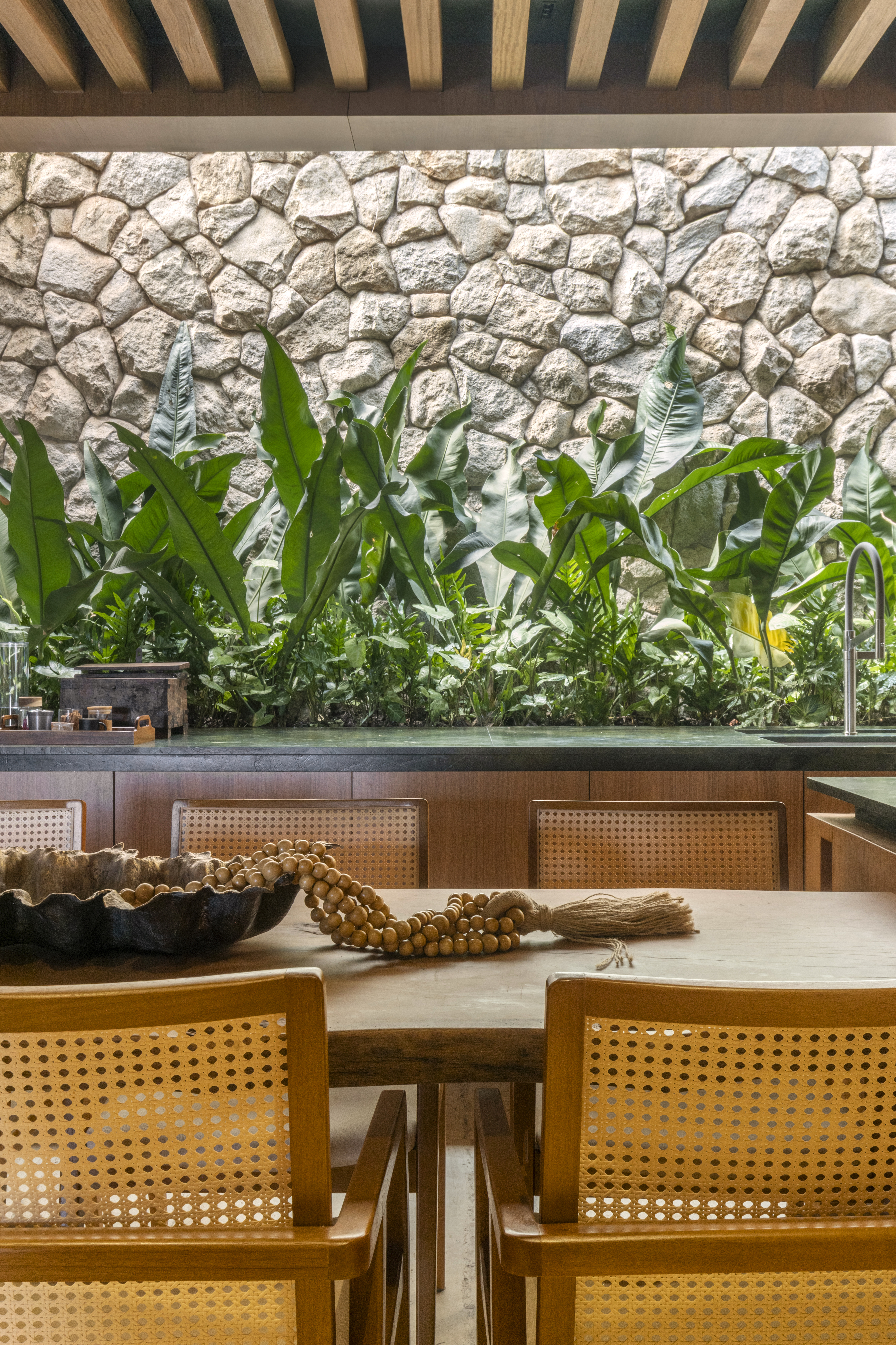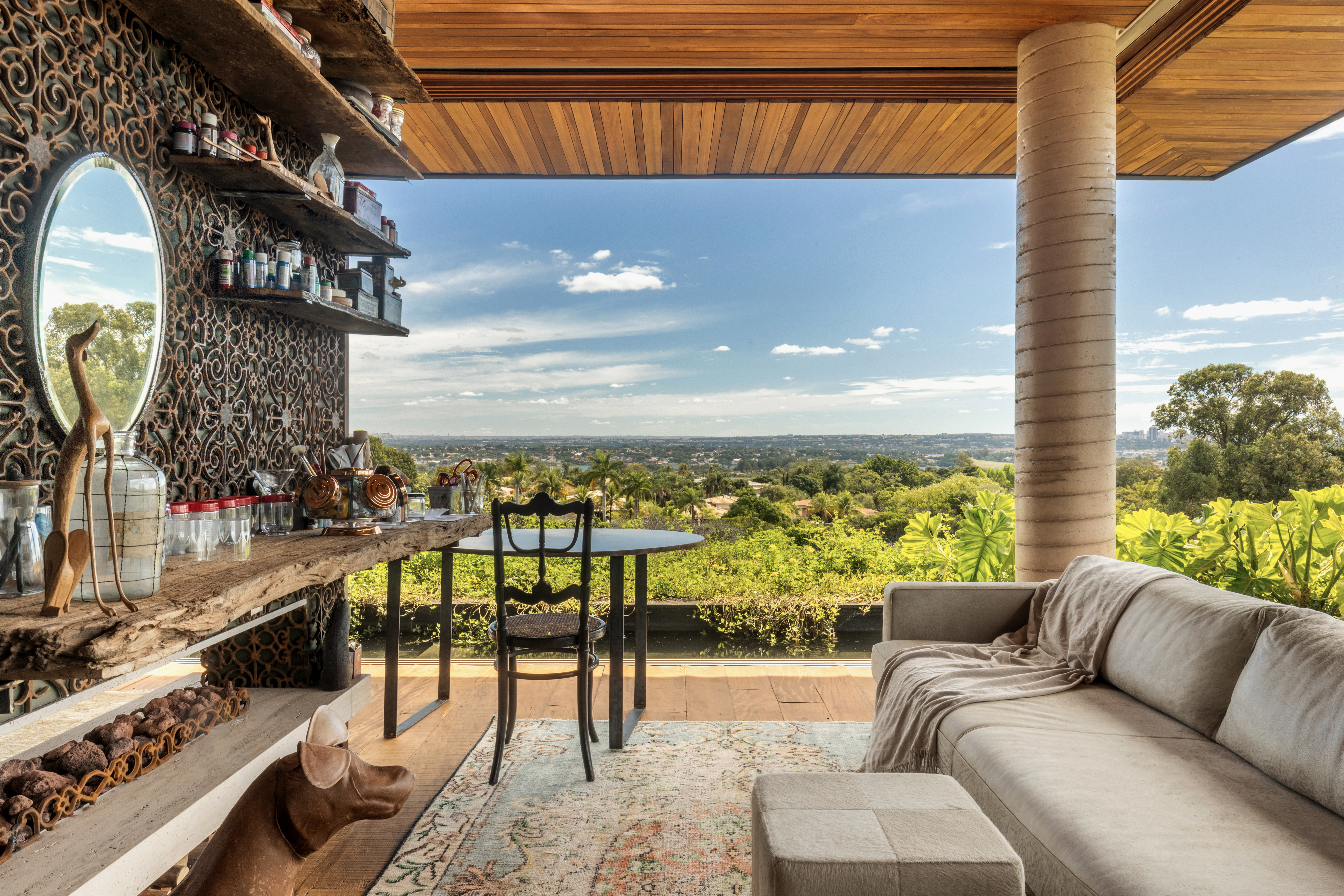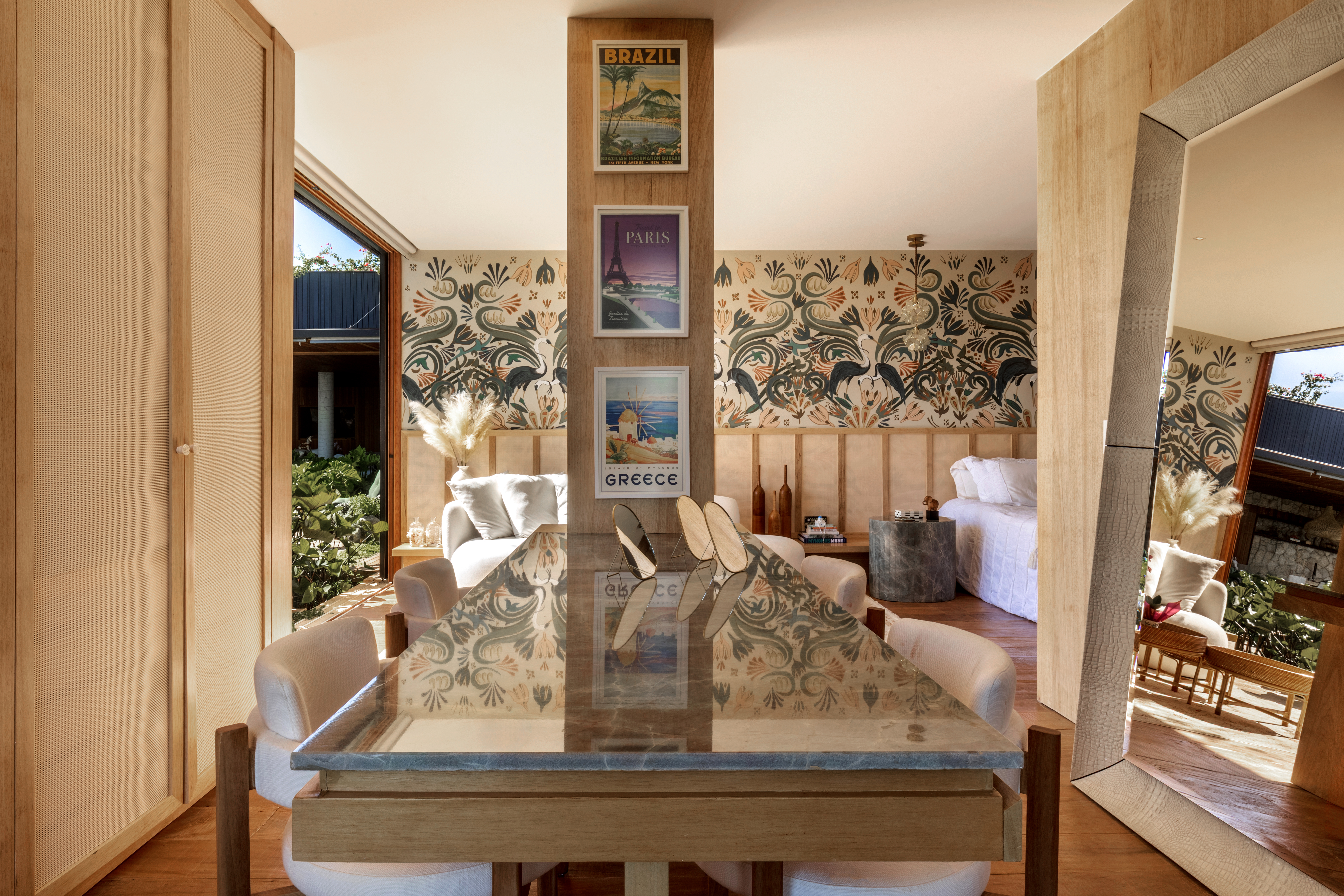 Os espaços sociais se abrem generosamente para fora, garantindo amplitude, luz e fluidez, ao mesmo tempo em que respondem à intensa incidência solar. A integração entre arquitetura, interiores e paisagismo se traduz em grandes planos de vidro combinados a brises, jardins, espelhos d’água e vegetação que atravessa a casa, equilibrando conforto térmico e conexão com a natureza.