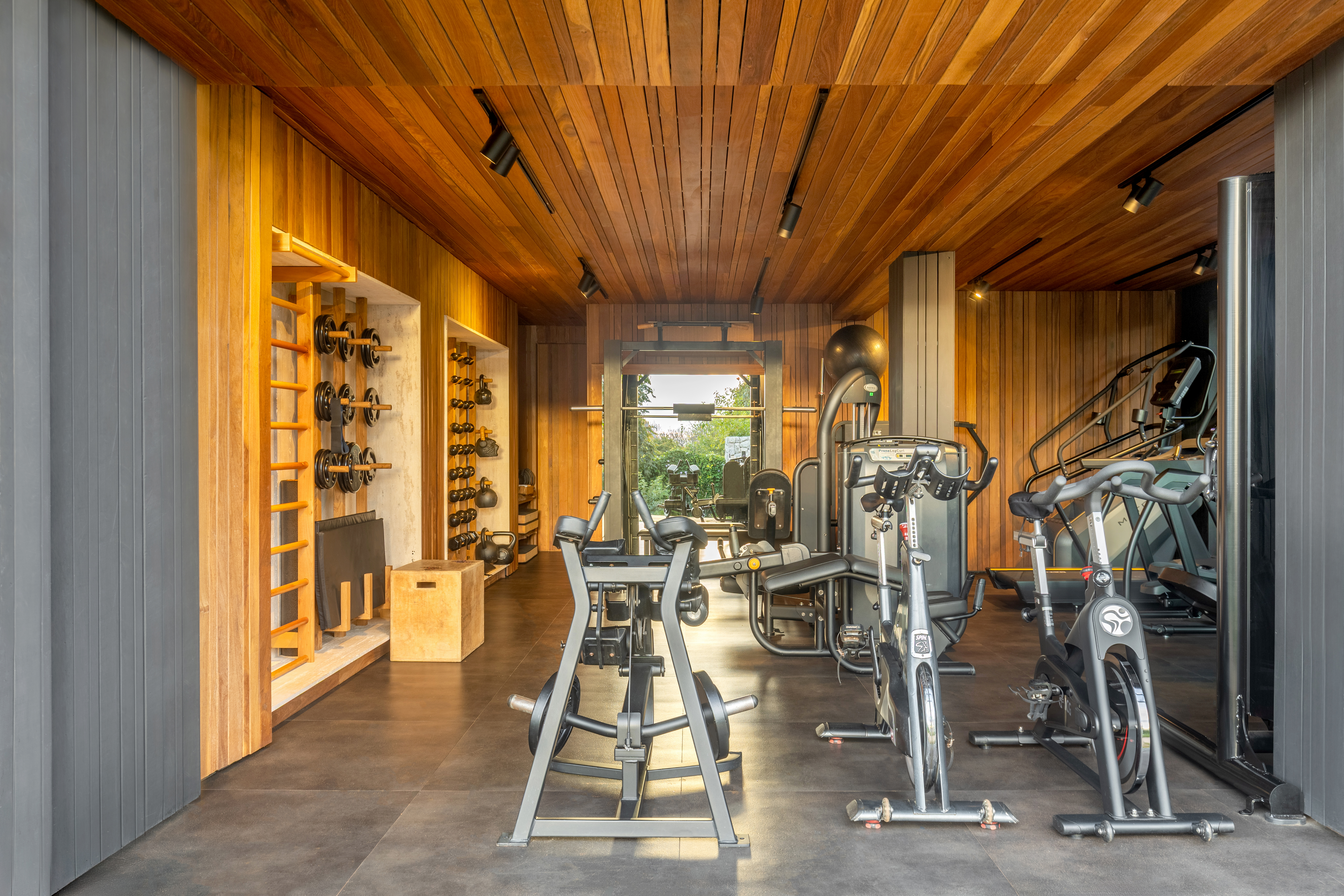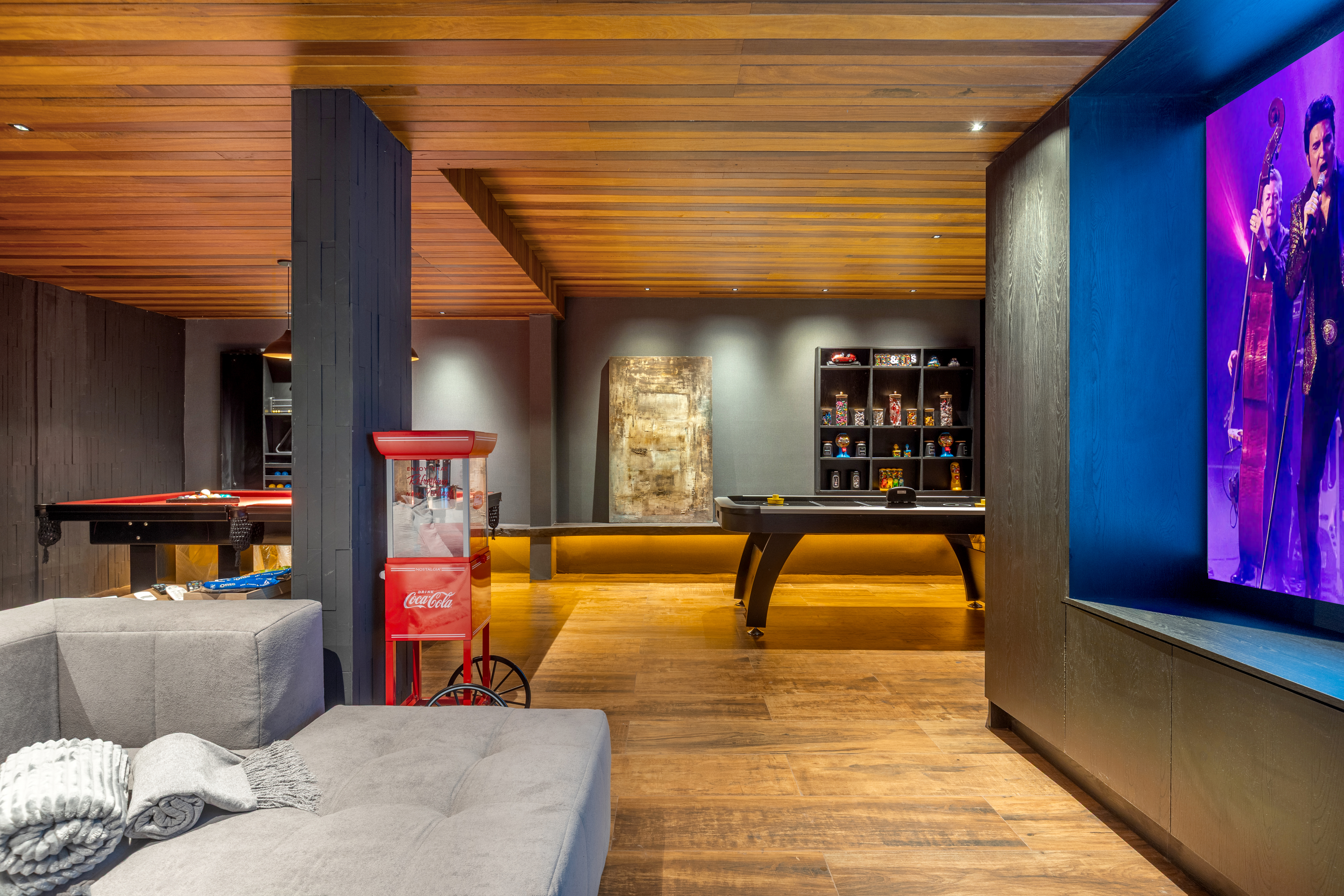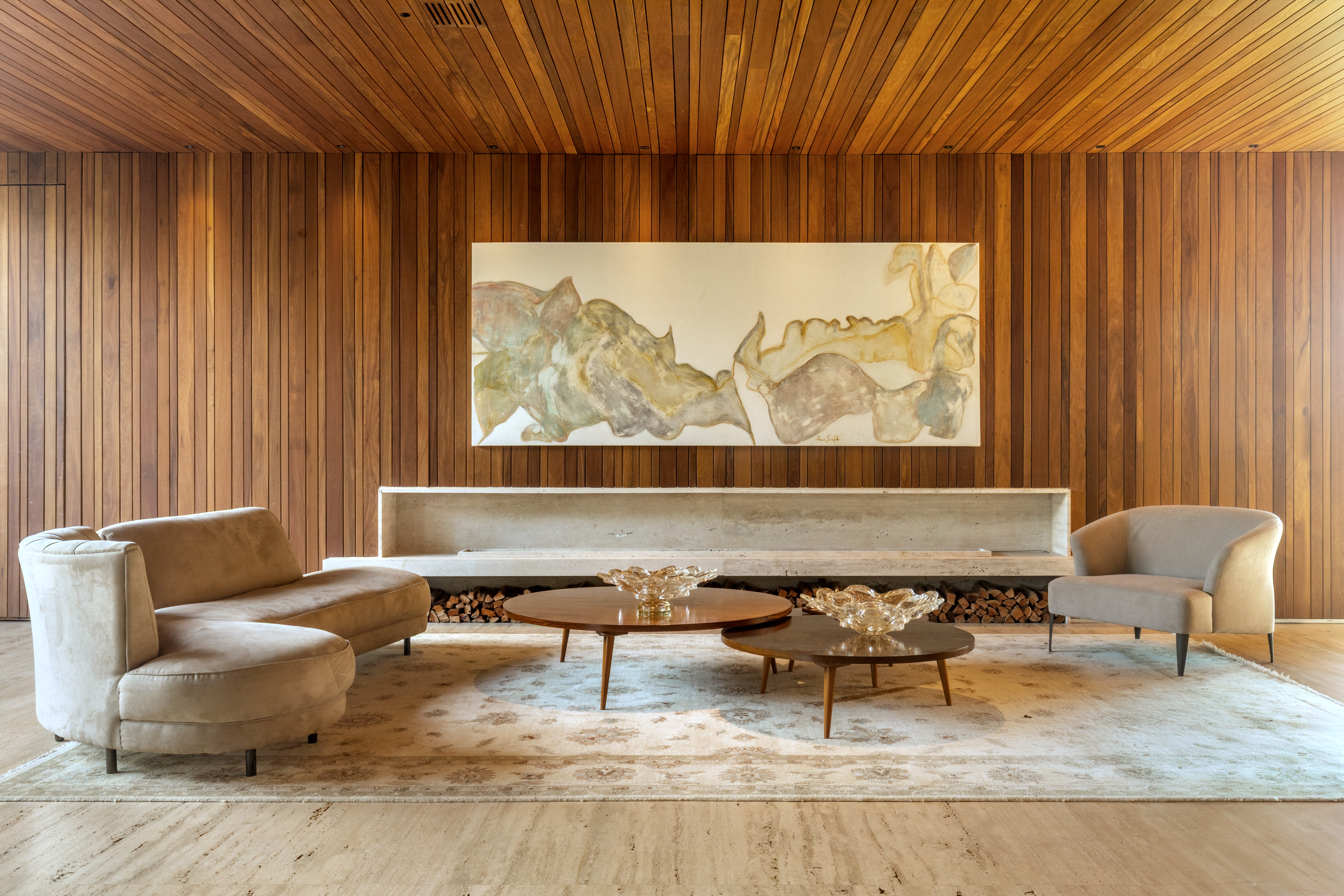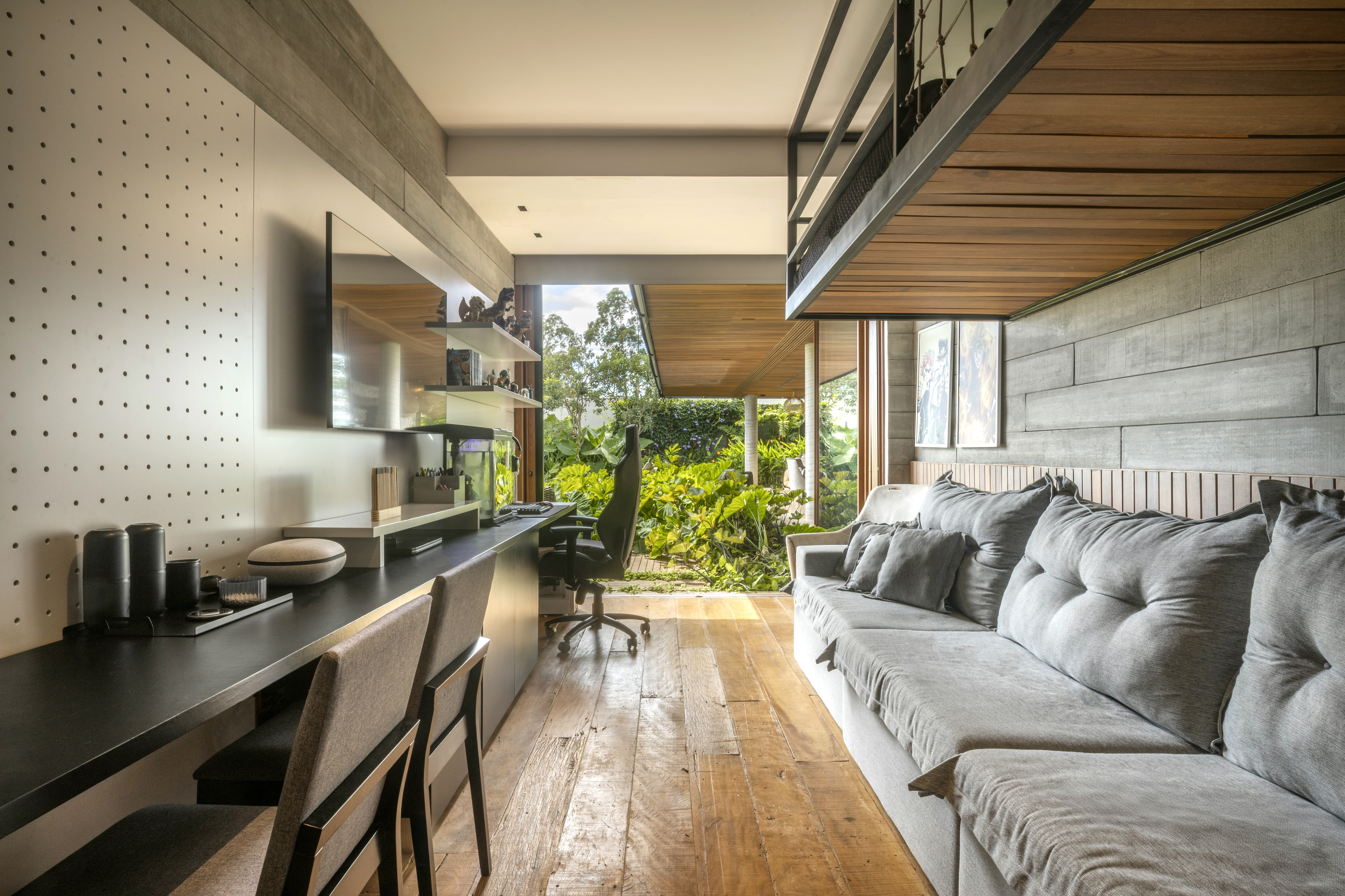 Os espaços sociais se abrem generosamente para fora, garantindo amplitude, luz e fluidez, ao mesmo tempo em que respondem à intensa incidência solar. A integração entre arquitetura, interiores e paisagismo se traduz em grandes planos de vidro combinados a brises, jardins, espelhos d’água e vegetação que atravessa a casa, equilibrando conforto térmico e conexão com a natureza.