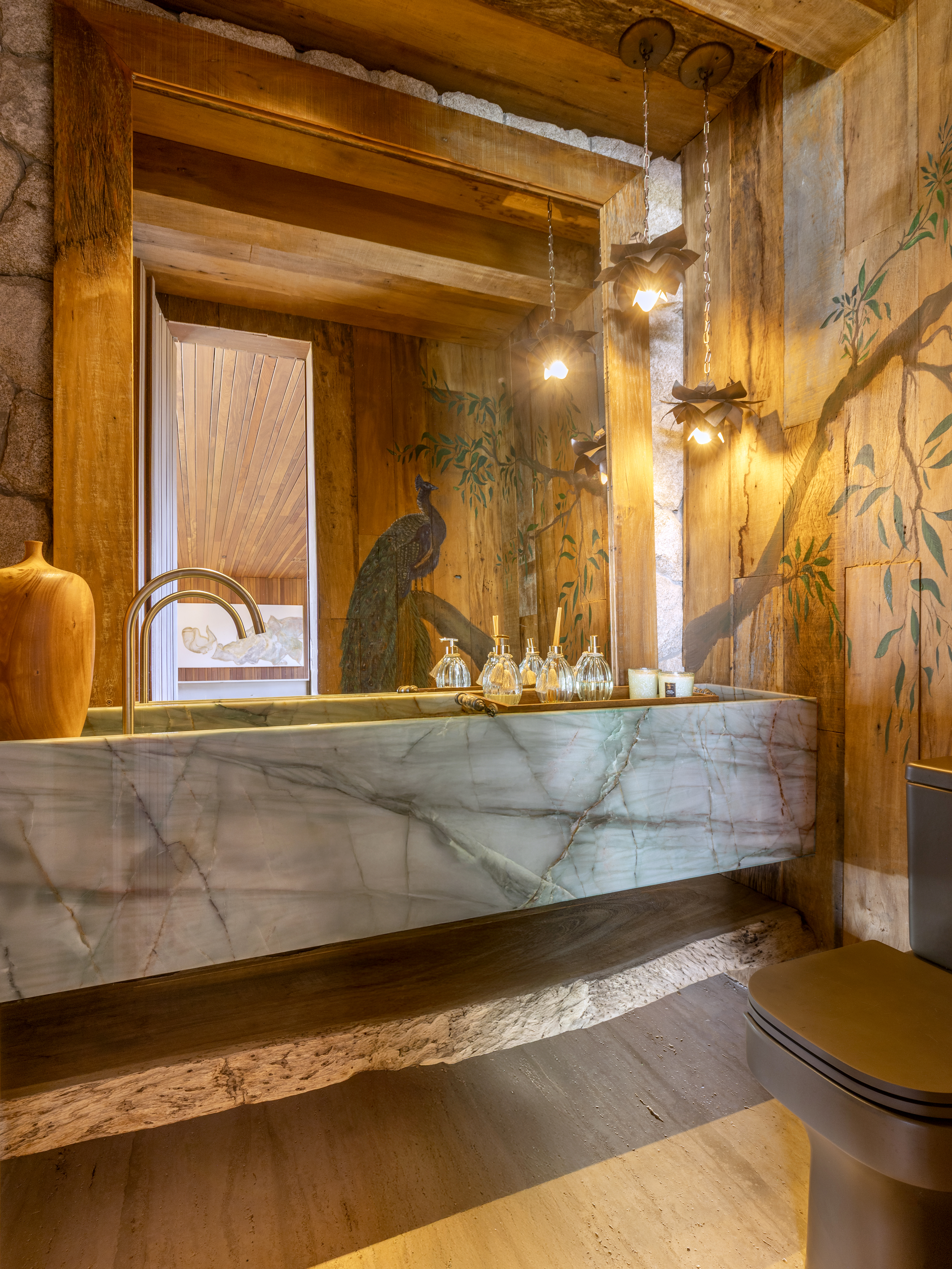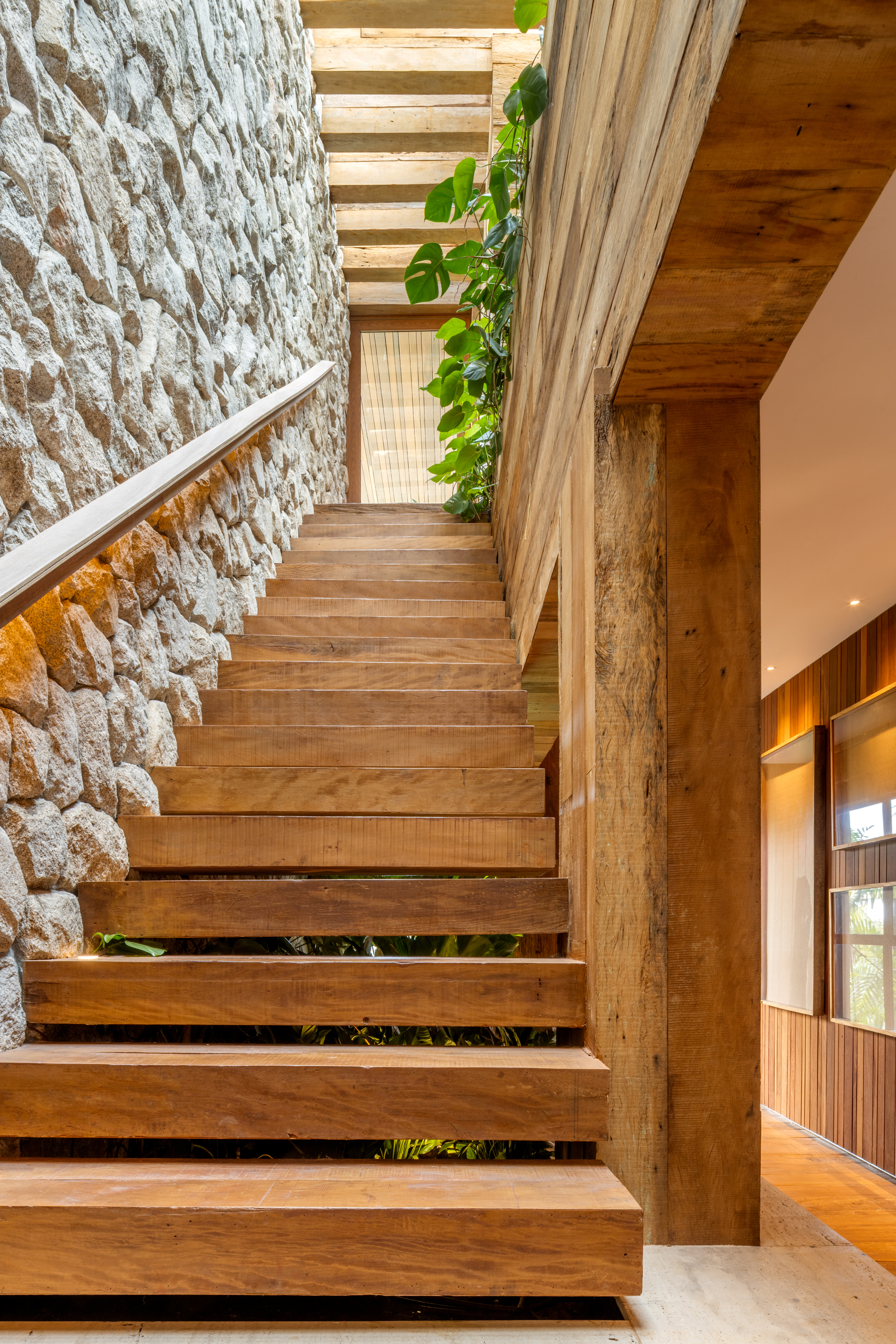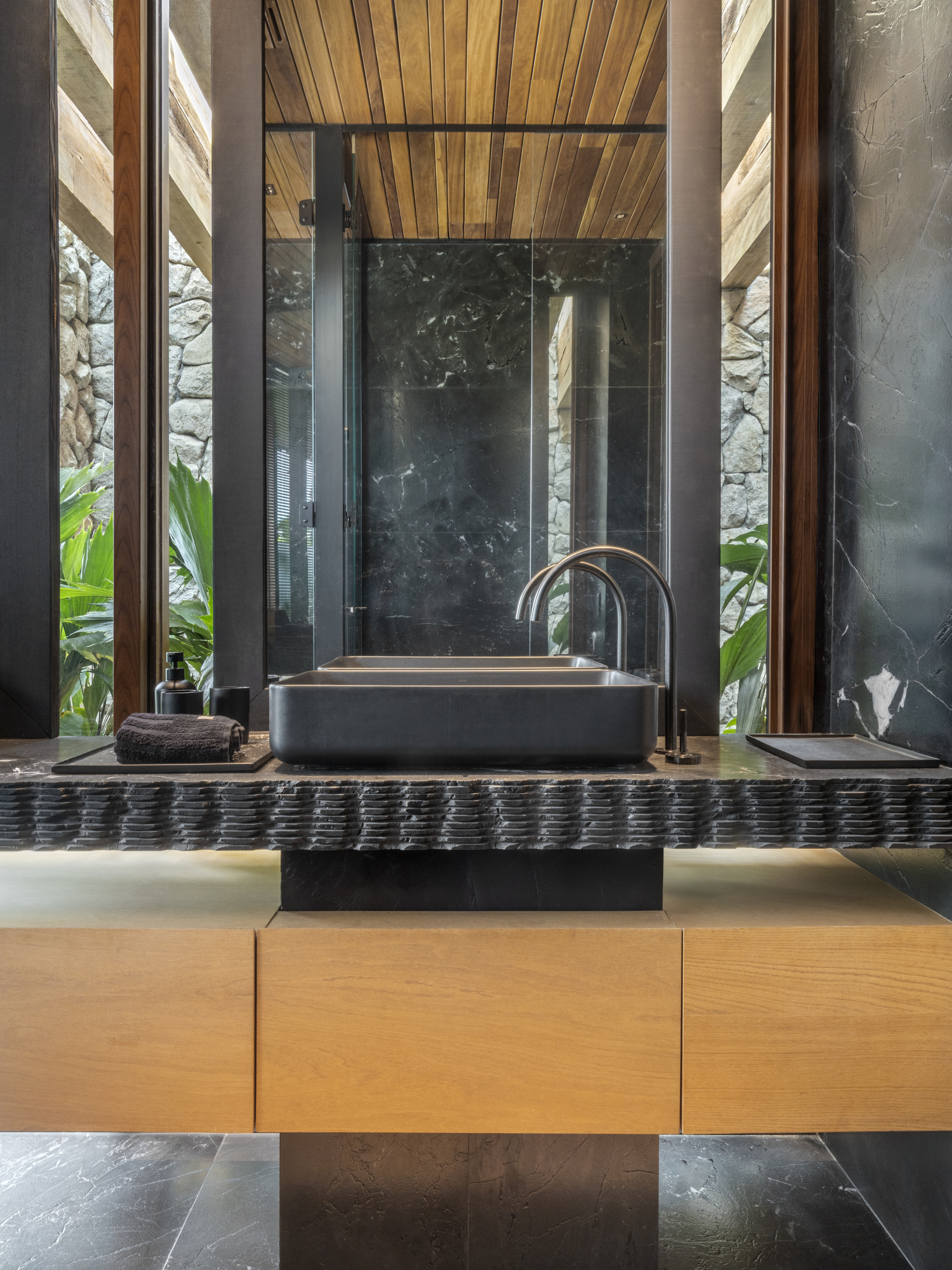 A materialidade reforça essa narrativa: por fora, uma volumetria contemporânea de casca preta contrasta com o verde; por dentro, pedra natural e madeira aquecem os ambientes. Cada espaço reflete a personalidade dos moradores, com destaque para o pavimento superior, onde a suíte do casal funciona como um loft privado. Natural, sensorial e ligada ao lugar, a Casa Vista é uma arquitetura que convida a olhar, viver e sentir.